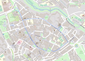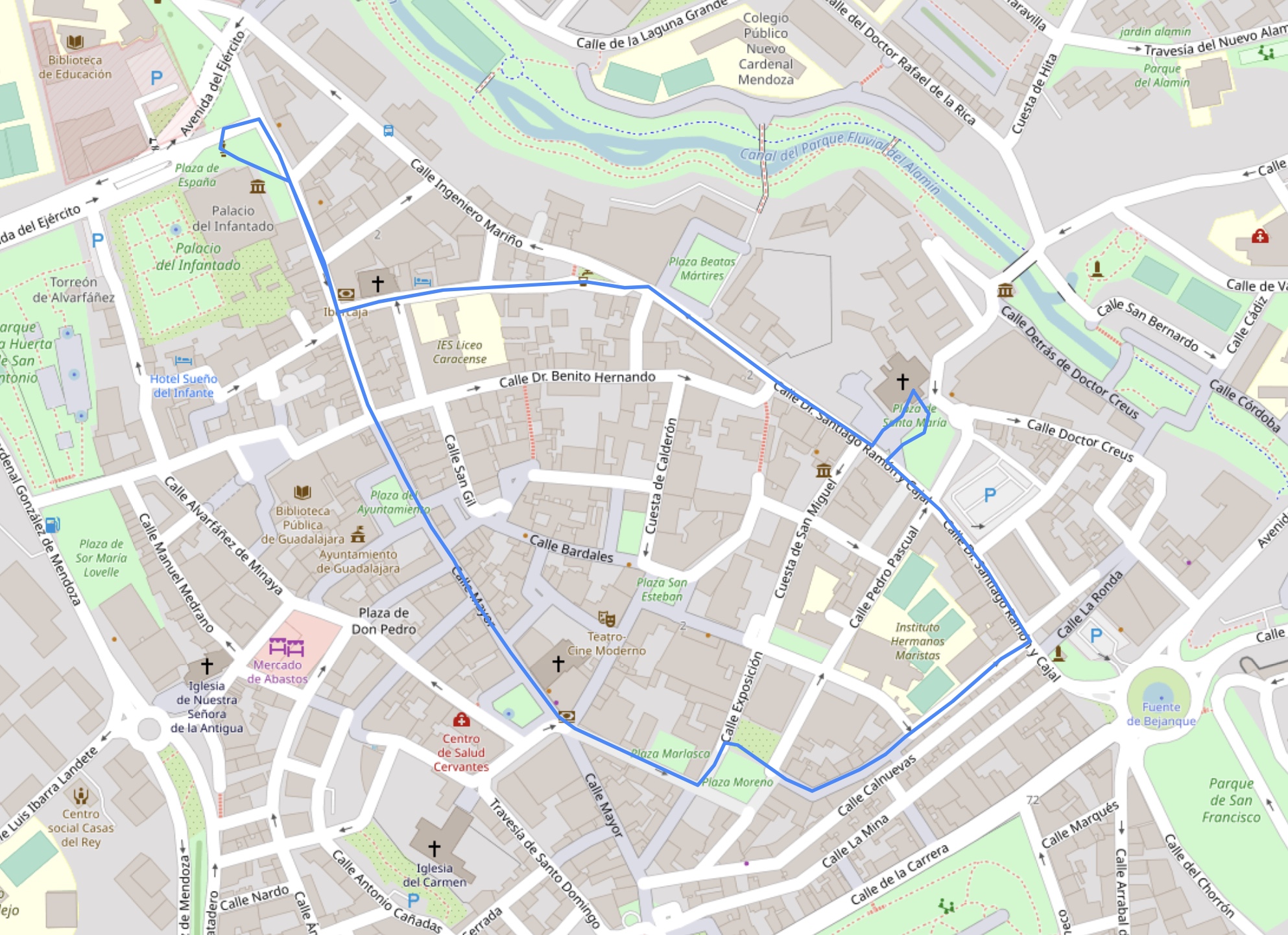 La documentación publicada del siglo XVI no precisa el itinerario de la procesión del Corpus Christi en Guadalajara, el cual pudo presentar pequeñas variaciones a lo largo de su historia. Pedro Pradillo propone un recorrido que partiendo de la iglesia de Santa María transitaría por las calles e instituciones sacras y cívicas más importantes de la ciudad, incluyendo la plaza de la iglesia de Santiago, la cual conectaba por el arco de los Perdigones con el Palacio de Infantado, en la que se disponía uno de los tablados para la representación de los autos sacramentales: