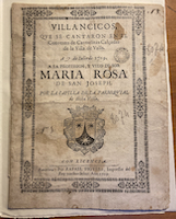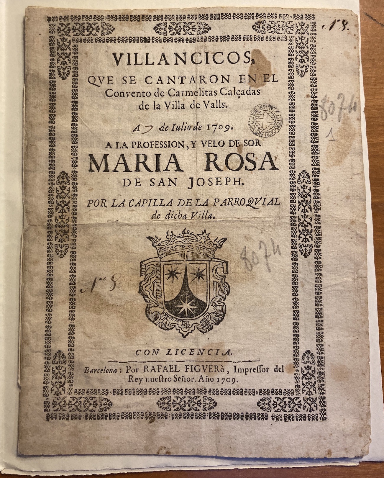 Villancicos que se cantaron en el convento de carmelitas calzadas de la villa de Valls, a 7 [manuscrito] de julio de 1709, a la profesión y velo de sor María Rosa de San José, por la capilla de la parroquial de dicha villa. Barcelona: Rafael Figueró, 1709.