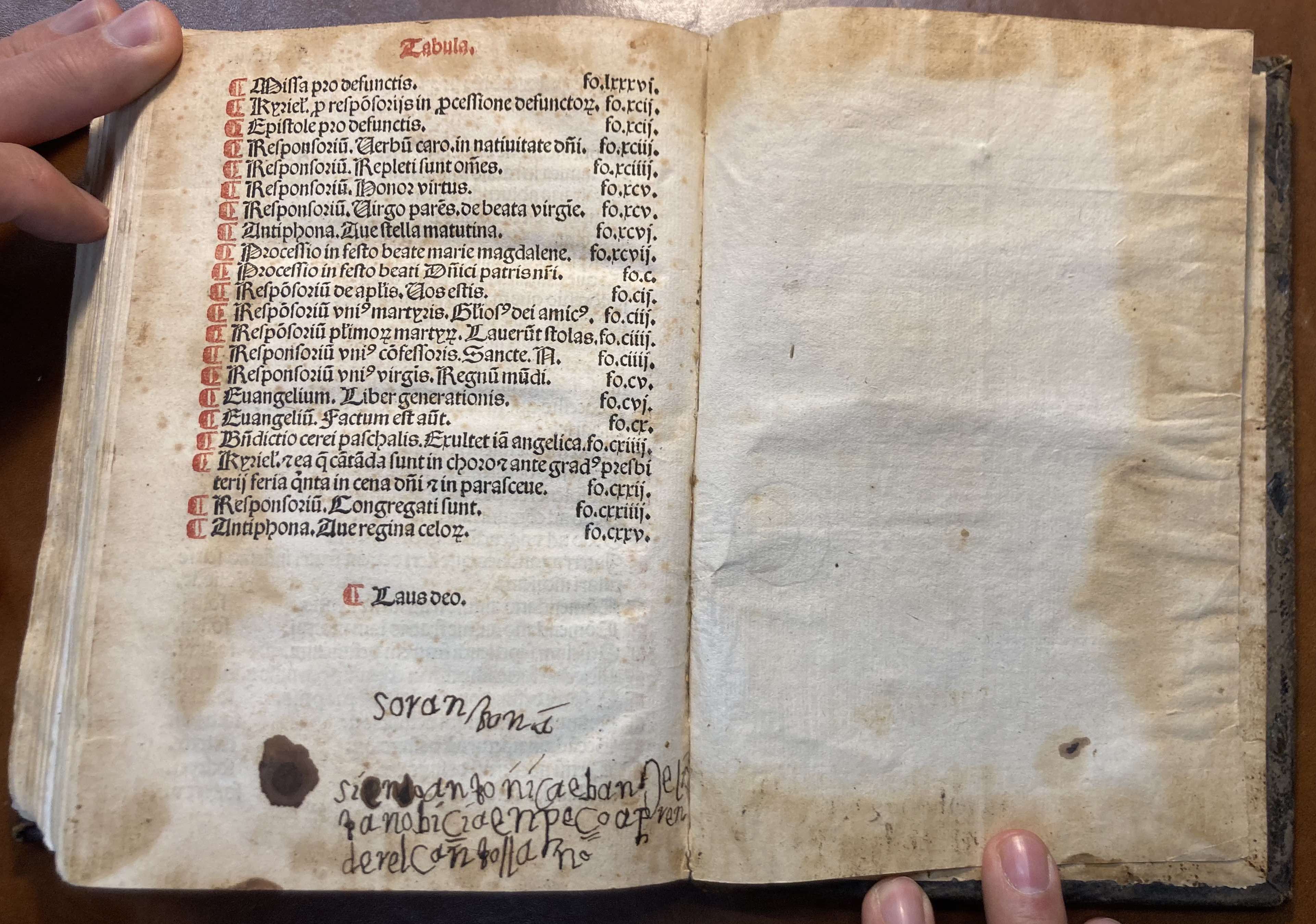 - En la parte inferior del final de la Tabula (fol. cxxviiv): “Sor Antonia | Siendo Antonica Ebanjelista nobicia enpeçó aprender el canto llano”.