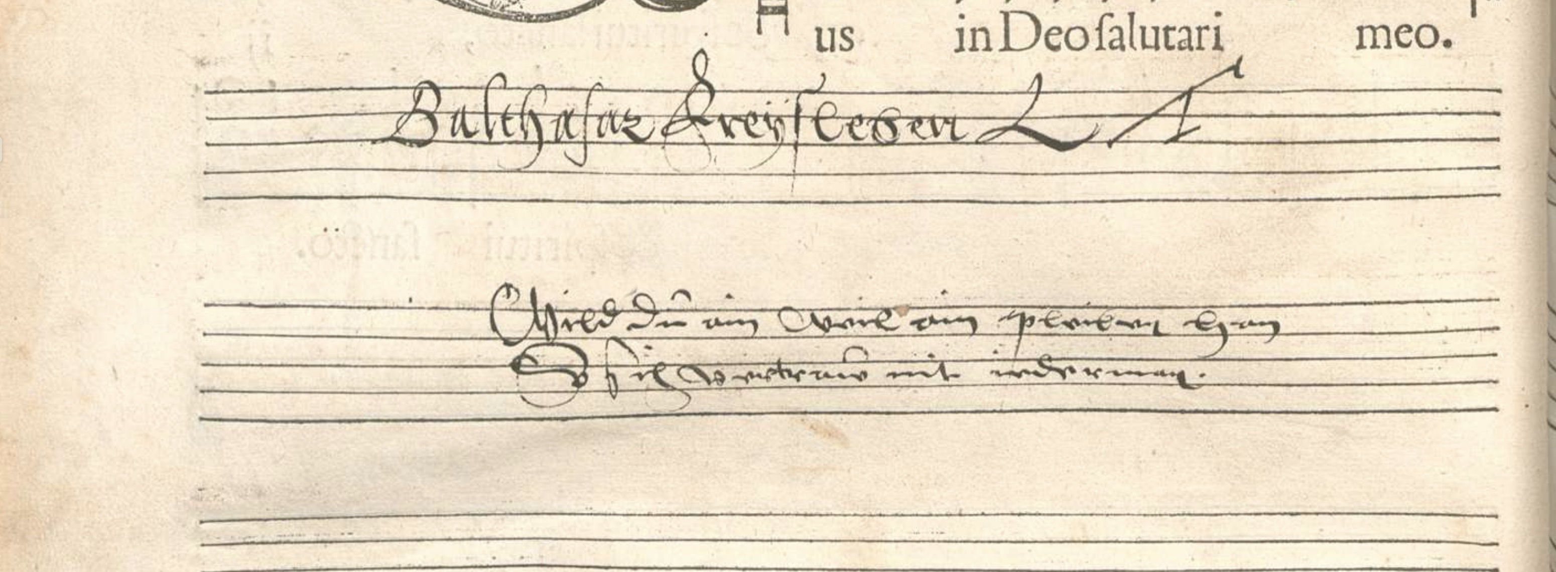- Fol. 68v. Inscripción en alemán: Bathasar Freysleben L T y debajo un texto que no he logrado descifrar (véase recurso). El único personaje con este nombre que he podido localizar era canónigo de la antigua abadía benedictina de Mattsee (Austria) en 1643. Esta institución había adquirido el rango de colegiata en 1045 y sus canónigos desempeñaban el cargo de párrocos en iglesias de su diócesis. En el caso de Balthasar Freisleben, sabemos que lo fue en Schörfling (Austria) entre 1614 y 1646. Dejo abierta las cuestiones de si se trata del mismo personaje o de si pudo ser el primer propietario del libro del Guerrero y estar implicado en su transmisión a la abadía de Tegernsee.