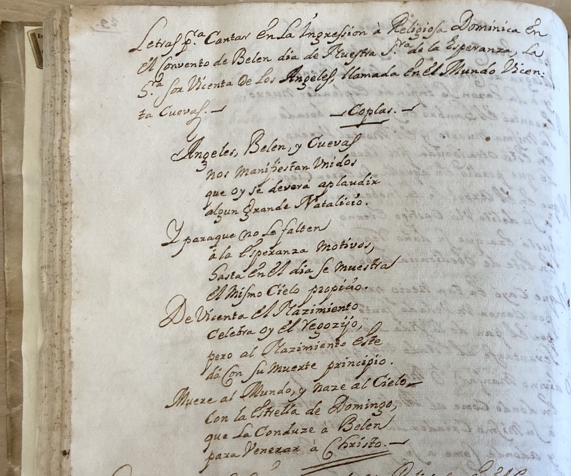 * Fol. 29v. “Letras para cantar en la ingresión a religiosa dominica en el convento de Belén, día de Nuestra Señora de la Esperanza, la señora sor Vicenta de los Ángeles, llamada en el mundo Vicenta Cuevas”.