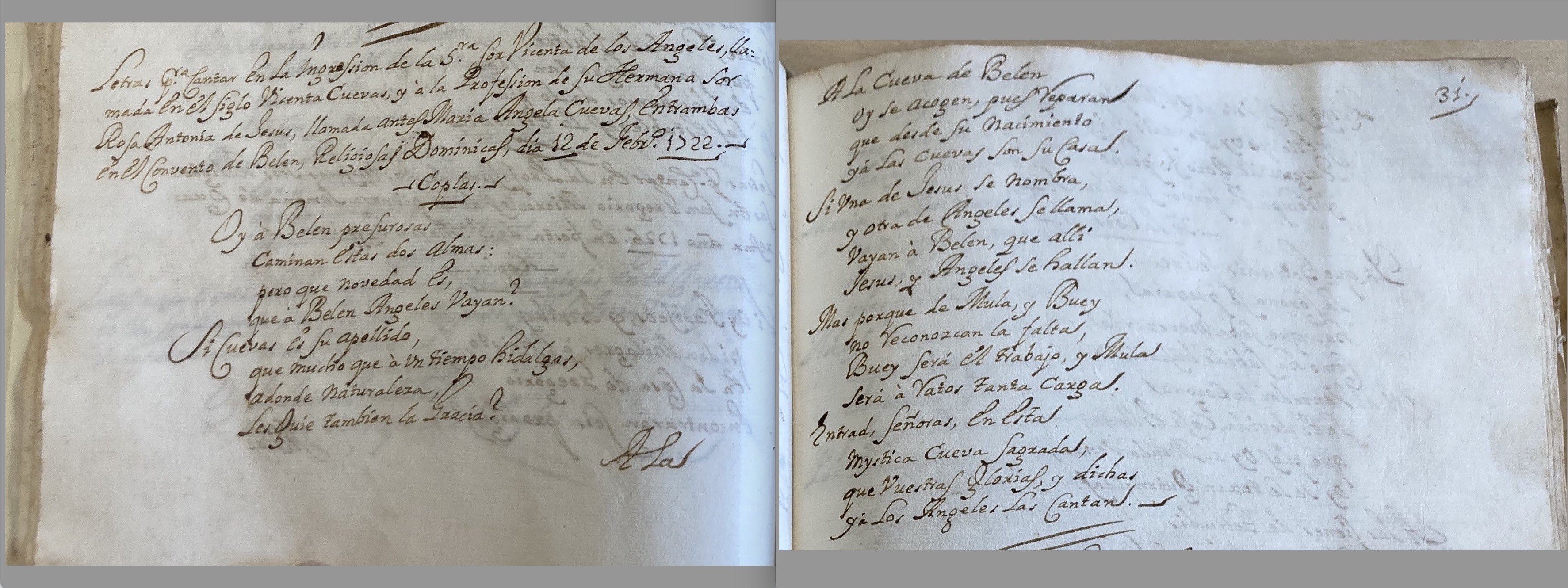 * Fols. 30v-31r. “Letras para cantar en la ingresión de la señora sor Vicenta de los Ángeles, llamada en el siglo Vicenta Cuevas, y a la profesión de su hermana sor Rosa Antonia de Jesús, llamada antes María Ángela Cuevas, entrambas en el convento de Belén, religiosas dominicas, día 12 de febrero 1722”.