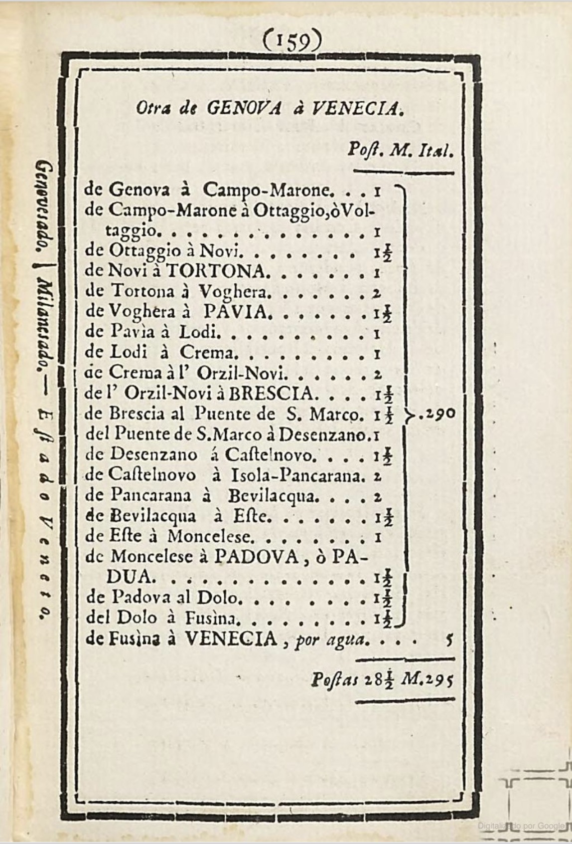 Francisco Guerrero es muy escueto en el relato de su primera parte del viaje a Jerusalén, ya que consideraba que el inicio real de su aventura se iniciaba en Venecia: “Llegado a Génova, pasé a Venecia y llegué a ocho de agosto” (fols. 10v). Nos proporciona Guerrero aquí la primera referencia cronológica concreta de su periplo. El viaje de Génova a Venecia debió ser por el interior del norte de Italia, pero, a diferencia de su regreso a España, desconocemos la ruta que pudo seguir. El Itinerario de las carreras de posta de dentro y fuera del reyno (1761) de Pedro Rodríguez de Campomanes propone distintas posibilidades para viajar entre esas dos ciudades. Por la diferencia de tiempo entre ellas y la premura de Guerrero por llegar a Venecia he decidido cartografiar la que unía Génova y Venecia pasando por Tortona, Pavía, Brescia y Padua, que se computa en 295 millas italianas (28 postas y media).