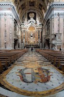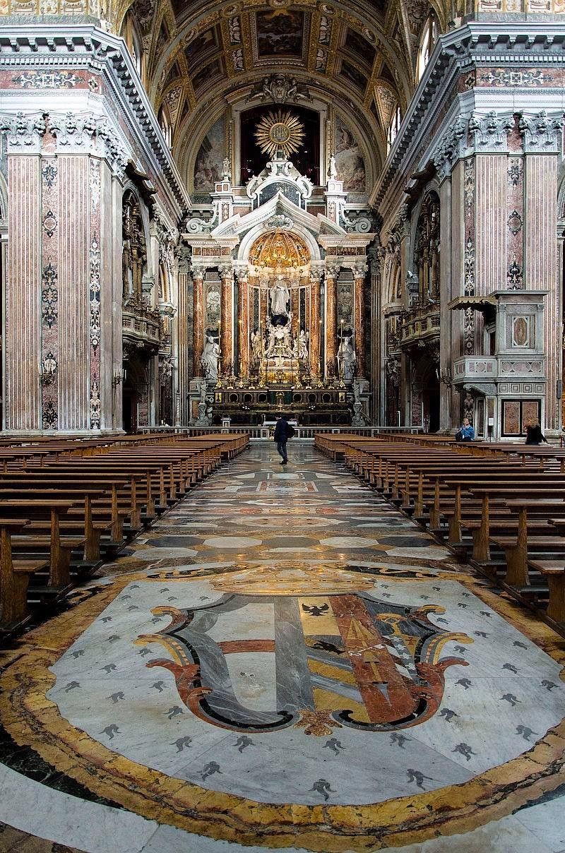 La iglesia del Gesù Nuovo, construida sobre el Palacio Sanseverino, del que conservó la fachada con sus características puntas de diamante, fue propiedad de los jesuitas desde 1584. Aunque había sido dedicada a la Inmaculada en 1601, muy pronto fue conocida con esa denominación para diferenciarla de la también jesuítica del Gesù Vecchio. Para la citada fiesta y juramento de 1618, el altar se ornamentó con especial riqueza y gran número de luminarias. En la capilla mayor se acondicionó un arco sobre dos columnas doradas y debajo del mismo se colocó una talla de la Purísima Concepción de “estatura natural”. Encima de la estructura se dispuso “un bello y hermoso cuadro de insigne pintura de Dios Padre”. De forma similar se adornó el cuerpo de la iglesia, “que es grandísimo”, colocándose en la parte superior de los arcos cuadros “de la Concepción de la Virgen y los atributos de este misterio, riquísimamente adornados con velillo de oro”.