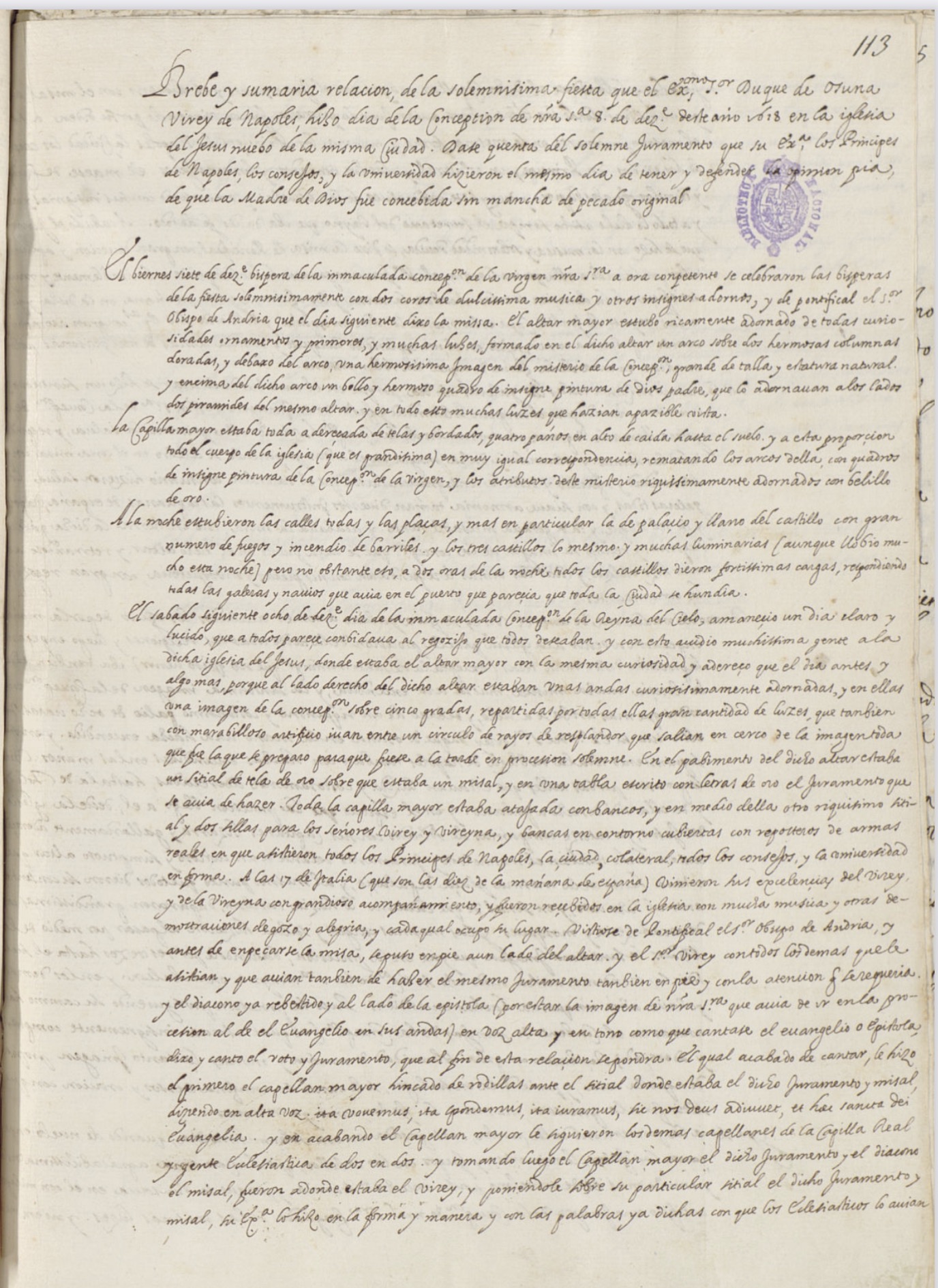 En 1618, Pedro Téllez-Girón y Velasco, III duque de Osuna y virrey de Nápoles, participaba en la celebración de la festividad de la Concepción de María y en el juramento inmaculista que tuvo lugar en la iglesia del Gesù Nuovo de esa ciudad. Una relación manuscrita de la misma conservada en la Biblioteca Nacional de España nos permite conocer algunos detalles de su particular paisaje sensorial.