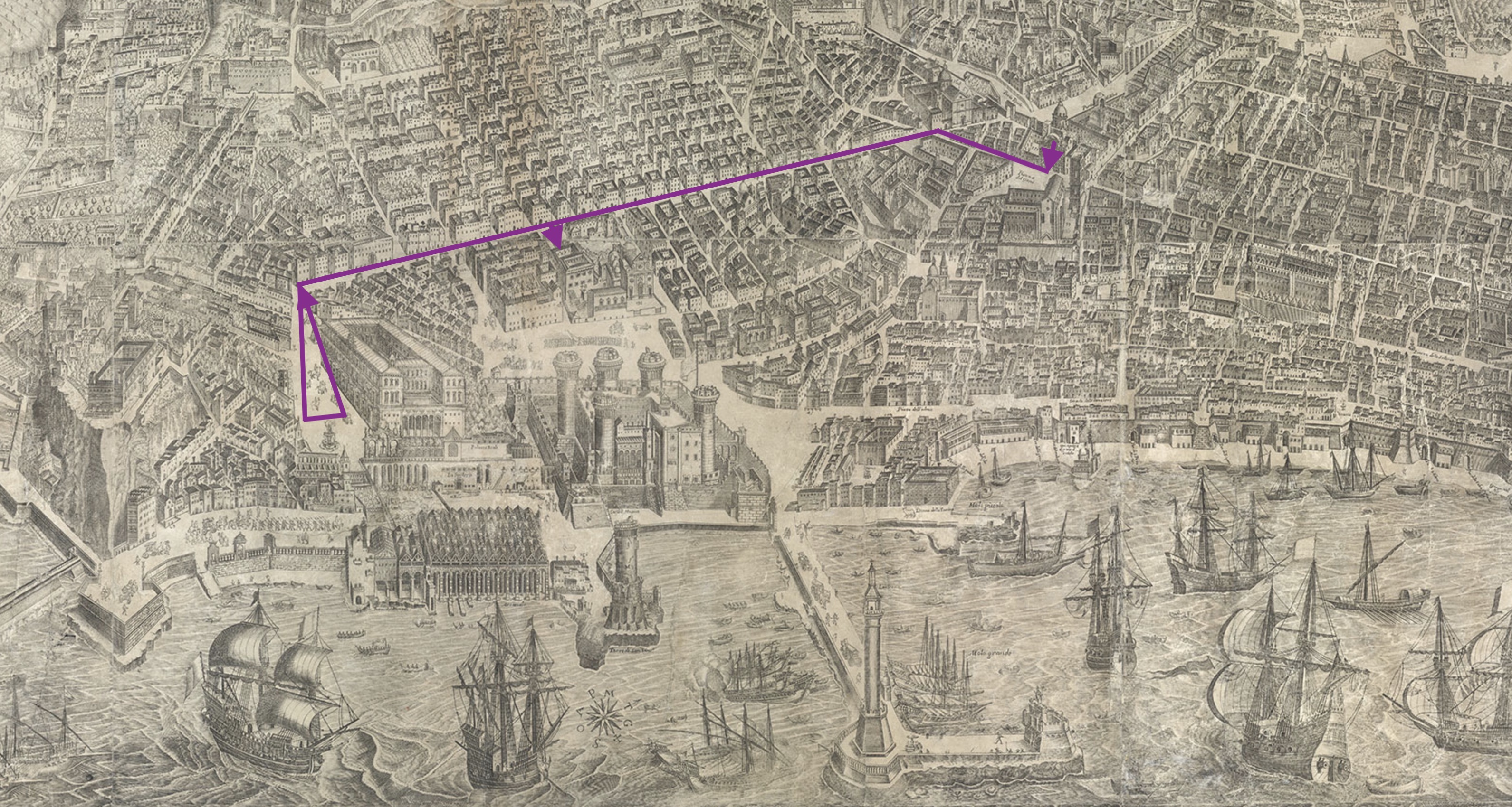 La duquesa contempló toda la escena desde su balcón. En este y en los demás del palacio se colocaron cincuenta hachas encendidas. Tras su paso por palacio, la comitiva continuó hasta el convento de la Concepción, en el cual entró: “estaba insignemente compuesto y aderezado y recibieron con gran solemnidad de música y motetes la santa imagen, propiedad de aquella casa, y poniéndola en su lugar, se le cantó su antífona, versos y oración con se dio fin a la procesión”.