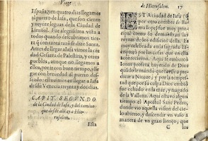 “Esta ciudad de Jafa (que por otro nombre se llama Jope) fue muy principal como lo demuestran las ruinas de los edificios della. Es muy celebrada en la sagrada Escritura por las cosas que en ella acontecieron. Aquí se embarcó Jonás profeta huyendo de Dios cuando le mandó que fuese a predicar a Nínive y por la tempestad que por su culpa Dios envió fue echado en la mar y tragado de la ballena [Jonas, 1:3]. Aquí estuvo algún tiempo el apóstol San Pedro, donde vio aquella visión del cielo abierto y decendir un vaso a manera de un gran lienzo que los cuatro cabos dél llegaban al cielo, lleno de serpientes y aves y otros animales, y Dios le mandaba que matase y comiese y lo demás que en los Actos de los Apóstoles dice en esta historia [Hechos, 11:5-10]. Aquí resucitó el mismo apóstol a una mujer que se llamaba Dorcas [Hechos, 9:36-43, Tabita = Dorcas (en griego)]. Por lo dicho y por lo mucho que hay que decir es famosa esta ciudad y puerto”.