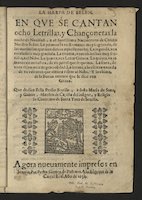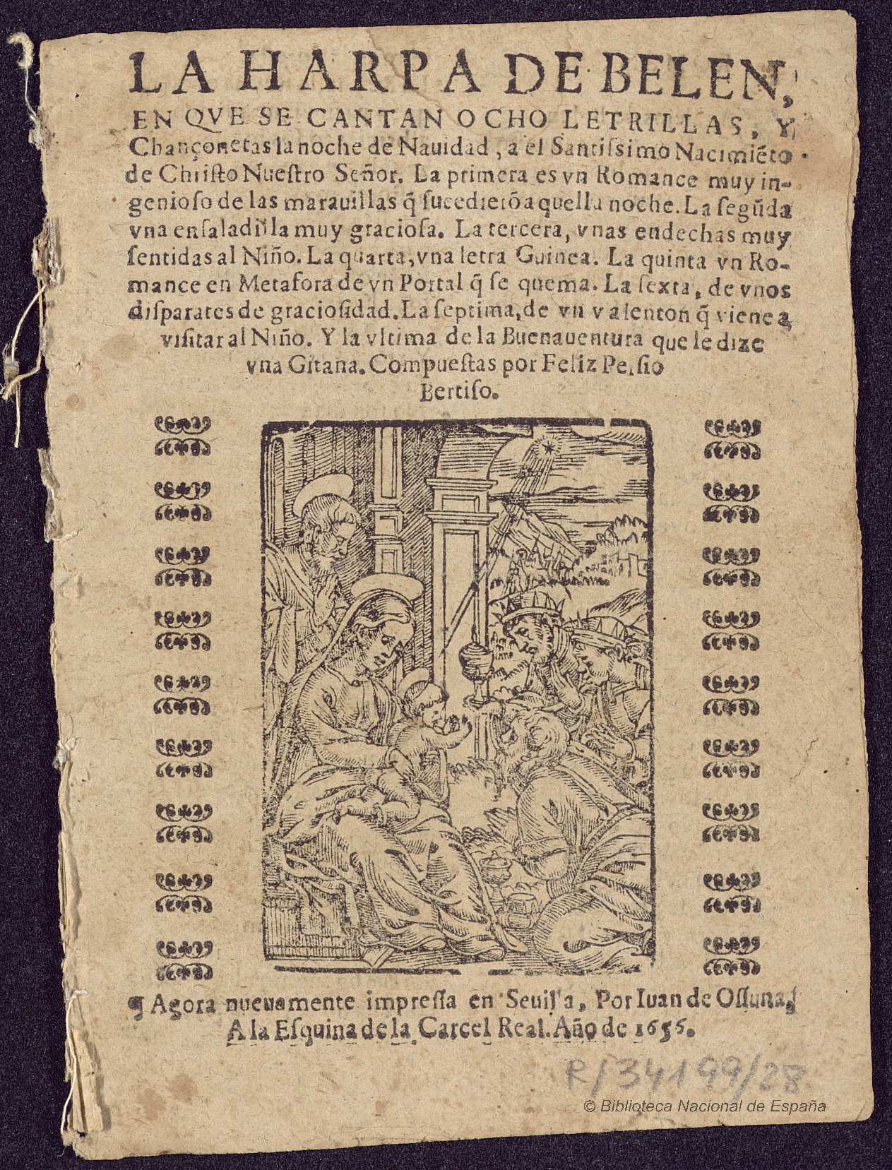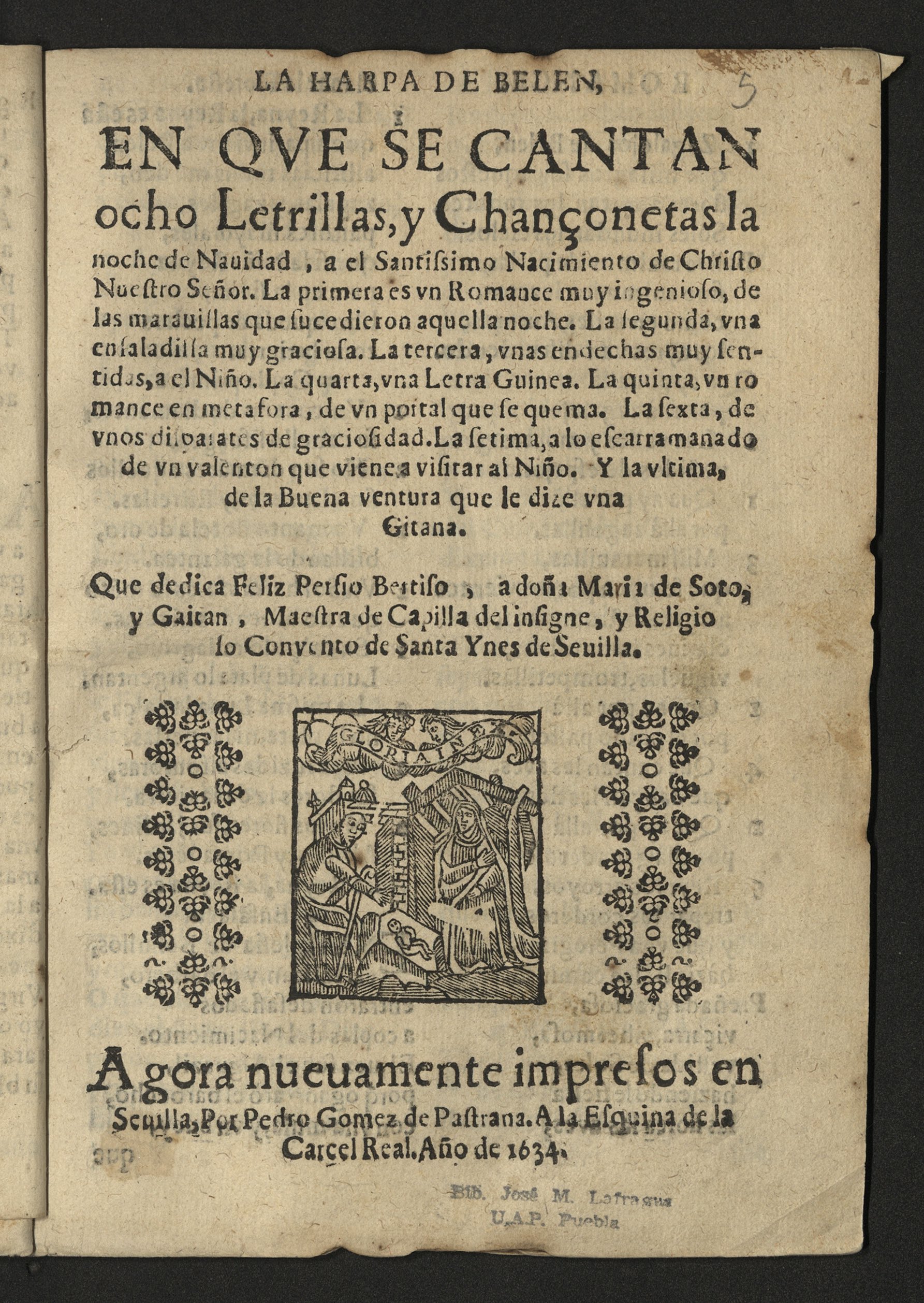 In the Biblioteca Histórica José María Lafragua, in Puebla, there is the only known copy of the earliest edition that has survived to the present day of a set of villancicos grouped under the title La harpa de Belén [MEX-Plf : 80070-42010404-7]. On the title page, the author of the texts, Félix Persio Bertiso, dedicates them to María de Soto Galán, “chapel master” of the convent of Santa Inés in Seville. These letrillas were printed again in 1655 and 1677.