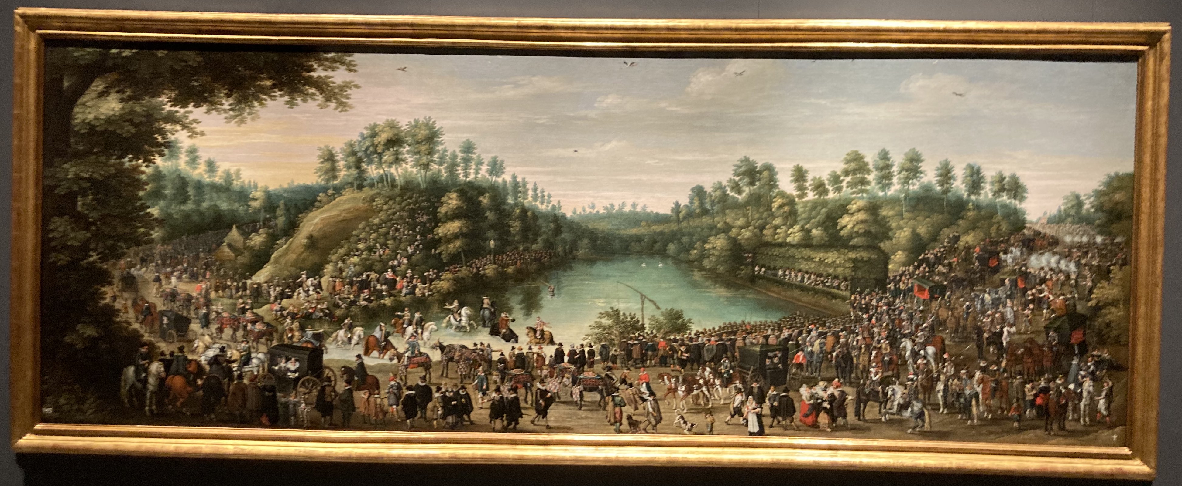 De la Fiesta del Vivier d’Oye en presencia de los archiduques (Fiesta de Nuestra Señora del Bosque) se conservan varias copias. La primigenia (117 x 327 cm), tras su paso por el Palacio del Pardo, se trasladó a la Galería del Palacio Real de Madrid en 2005 y actualmente se exhibe en el nuevo museo de la Galería de las Colecciones Reales. Una variación de la misma (153 x 235,5 cm) está en los fondos no expuestos del Museo del Prado, con el título Fiesta de Nuestra Señora del Bosque (1616), y se considera un encargo también de Isabel Clara Eugenia a van Alsloot para regalarla a su hermano Felipe III. En los Musées royaux des Beaux-Arts de Belgique hay una réplica del taller de van Alsloot (120 x 322 cm). A estas hay que sumar otra copia en una colección particular belga y una última, de menor formato (83 x 119,5 cm), en tabla, en el Koninklijk Museum voor Schone Kunsten de Amberes. Para este artículo, analizaremos los dos lienzos conservados en Madrid, ya que presentan algunas diferencias significativas, la más destacada es que en la del Museo del Prado no se copió la parte izquierda del lienzo –como sucede también en la tabla del KMSKA–, en la que se ve la continuación del camino por el que discurren los carruajes tras haber bordeado el lago, presente también en la copia de Bruselas.