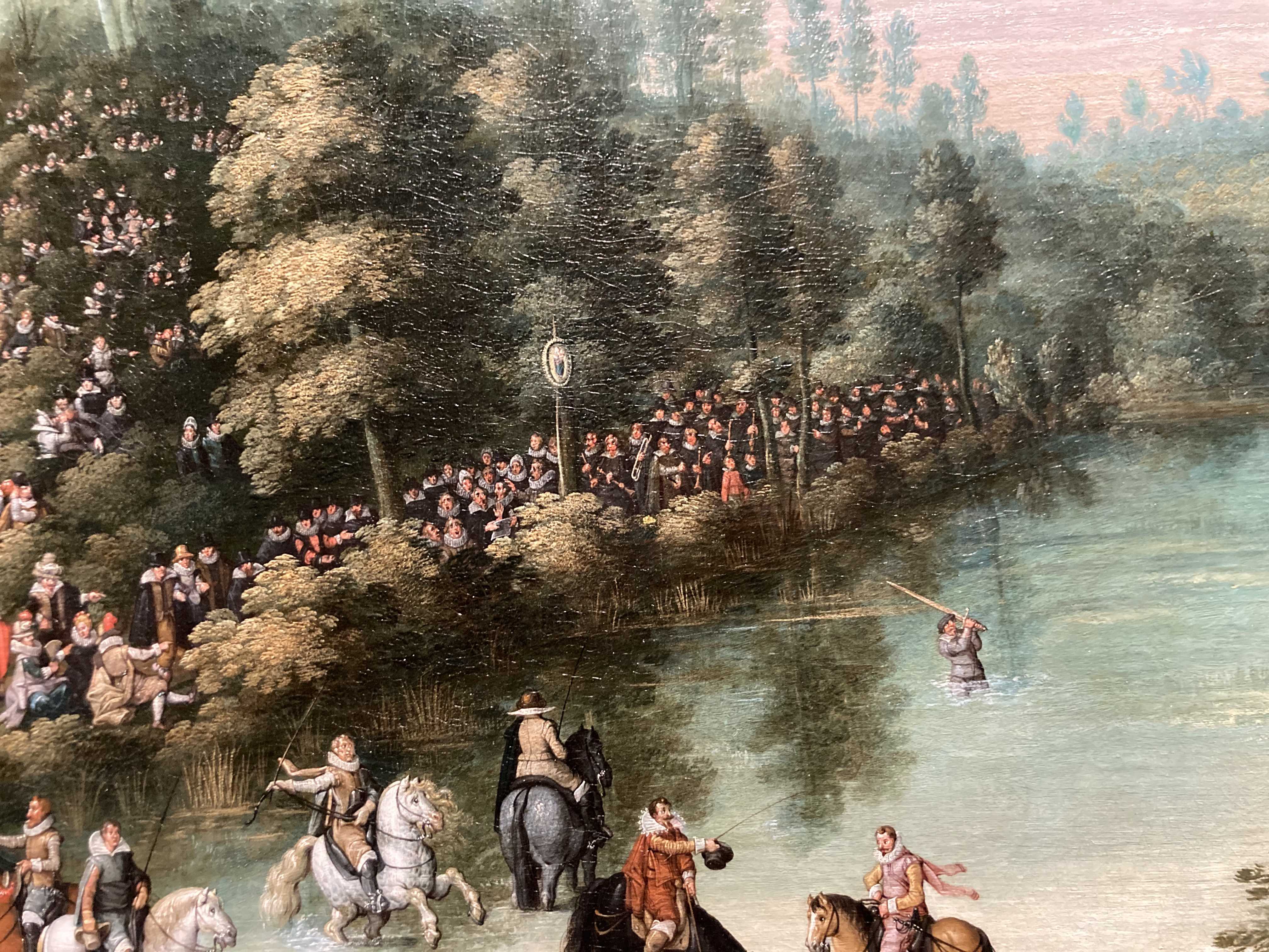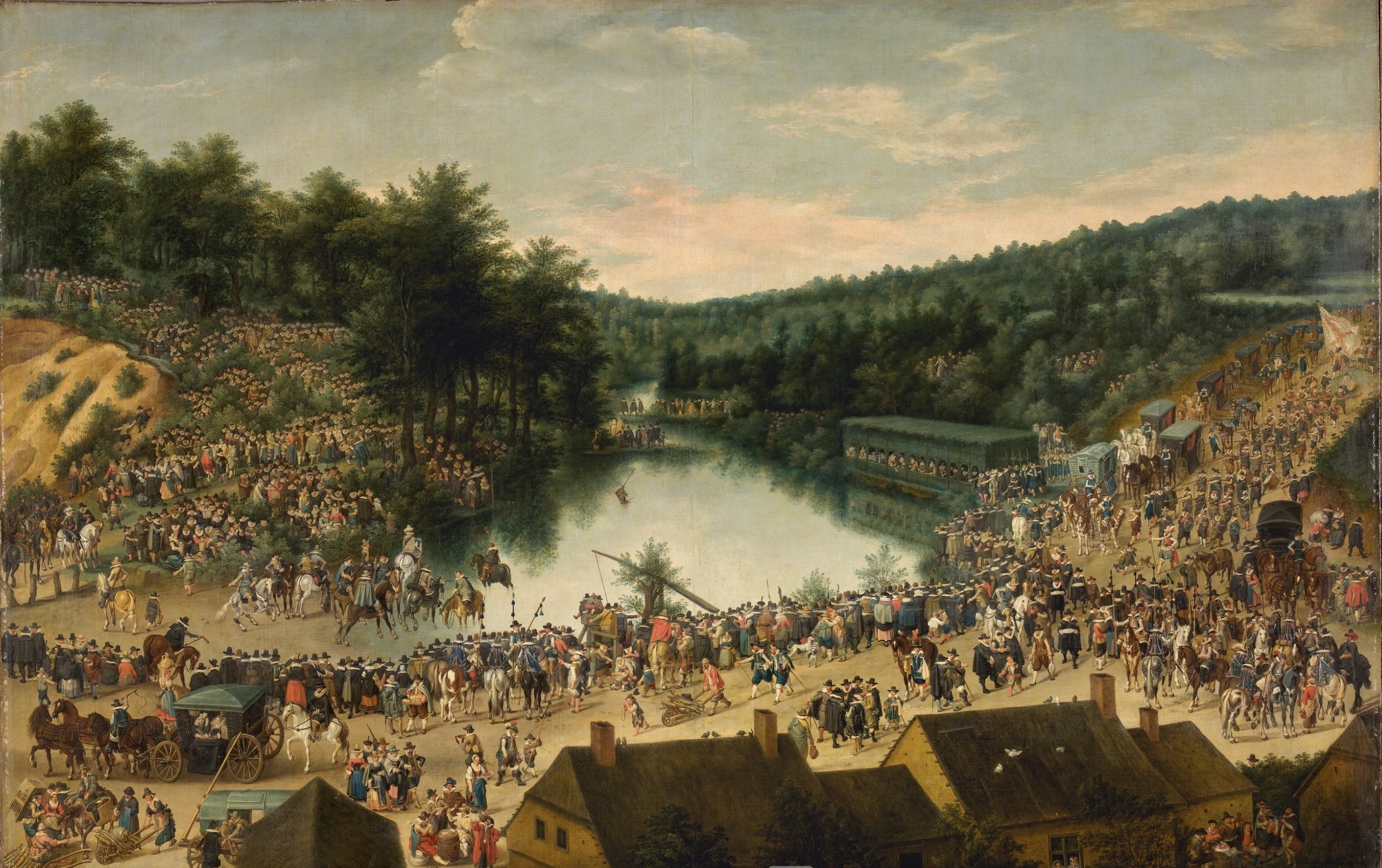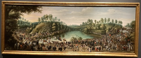La escena se localiza en los alrededores de Vivier d’Oye (= Diesdelle), en un estanque situado al sur de Bruselas, en los límites del bosque de Soignes. En la orilla derecha (recursos, detalle 1), podemos ver el pabellón efímero construido para alojar a Isabel Clara Eugenia y al archiduque Alberto de Austria, gobernadores de los Países Bajos españoles, el cual se encuentra perfectamente integrado en el paisaje del lugar. Sus figuras, situadas a la izquierda, pueden identificarse claramente, separadas por una mesa con viandas del resto de los miembros de su corte.