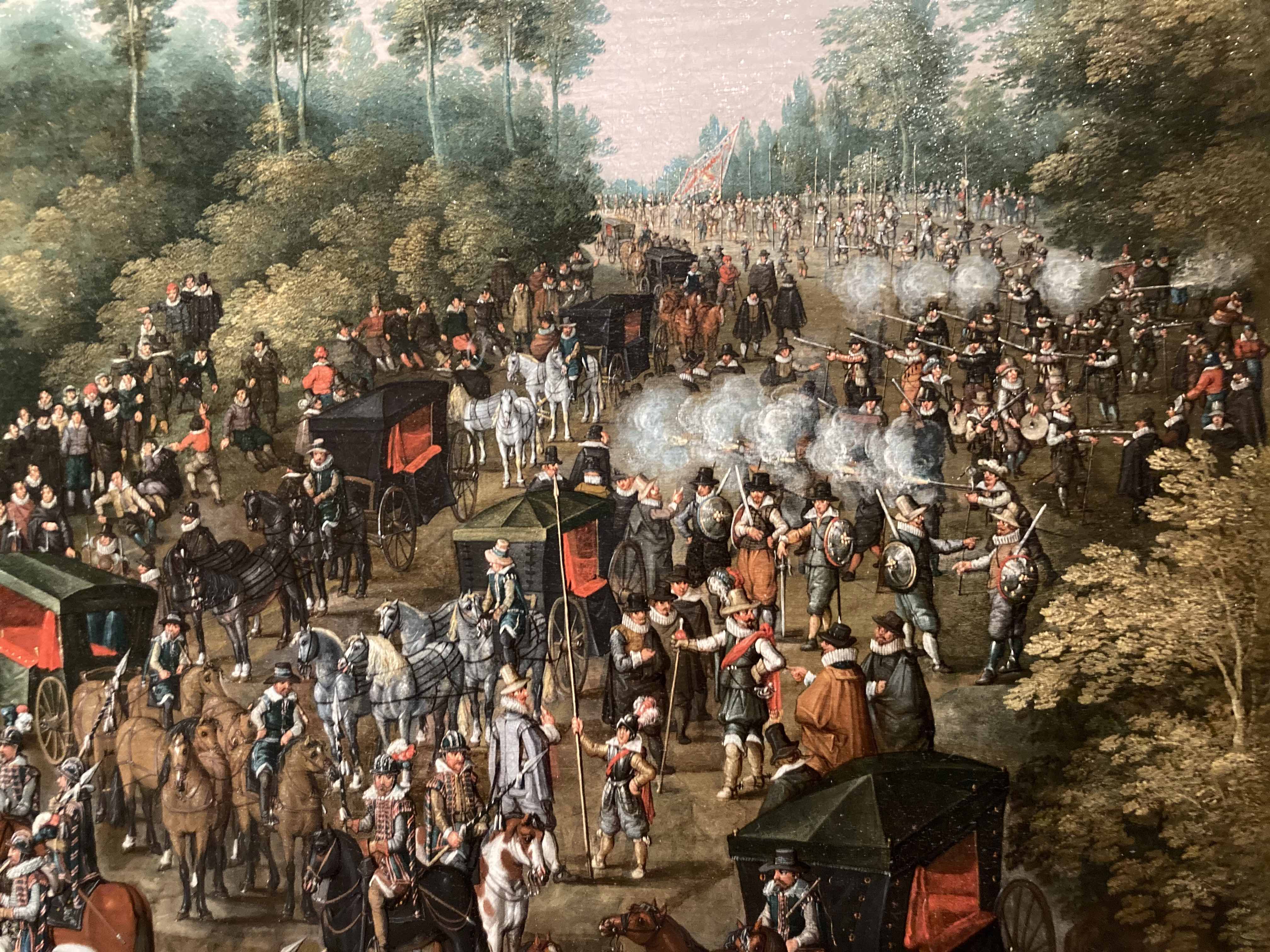 - El de las salvas de los arcabuces (disparadas desde sus soportes de horquilla) que curiosamente solo se evidencian en el lienzo de las Colecciones Reales, así como el repiqueteo de las picas en el suelo (recurso, detalle 2).