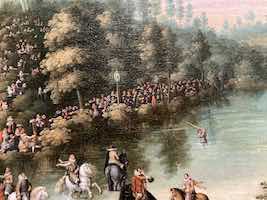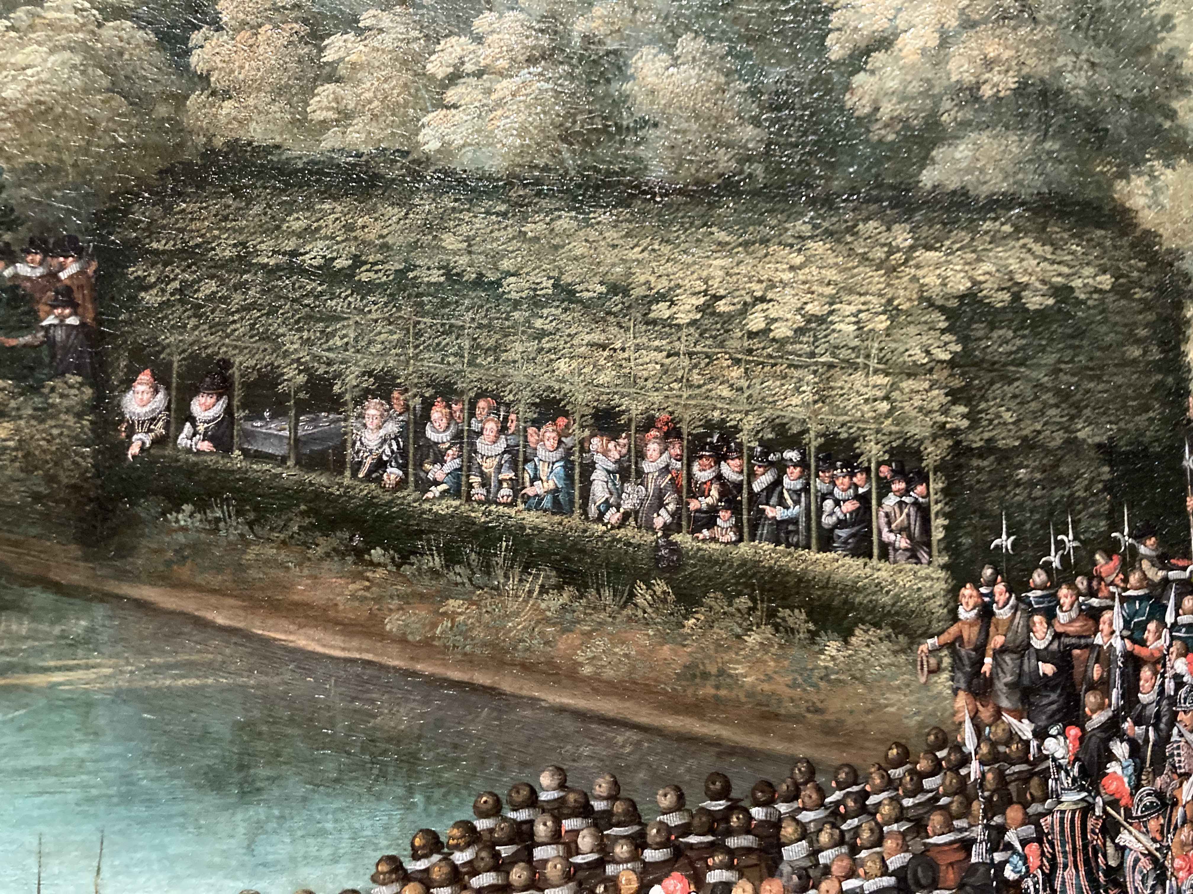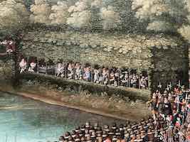 - En la orilla izquierda, enfrente del pabellón de los archiduques, se encuentran los miembros de la capilla vocal y el grupo de ministriles. Ambos conjuntos se encuentran mejor definidos en el lienzo de las Colecciones Reales (recurso, detalle 4). En el grupo vocal, en el cual parecen estar cantando nueve personas, dos de ellas mujeres, uno de sus integrante lleva una partitura. Los archiduques disponían de una capilla a cuyo frente, en estos años, se encontraba Géry de Ghersem, y de otro conjunto de cámara que lideró hasta 1614 Pedro Rimonte El conjunto instrumental está mirando cantar a la capilla y está formado por cuatro chirimías (tal vez una quinta, si consideramos que es un instrumento lo que lleva el personaje situado más a la izquierda), una corneta y un sacabuche, similar a la imagen bien conocida que encontramos en otros cuadros de la serie, donde se aprecian con más detalle y en el que uno de los instrumentistas toca un bajón.