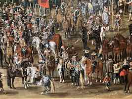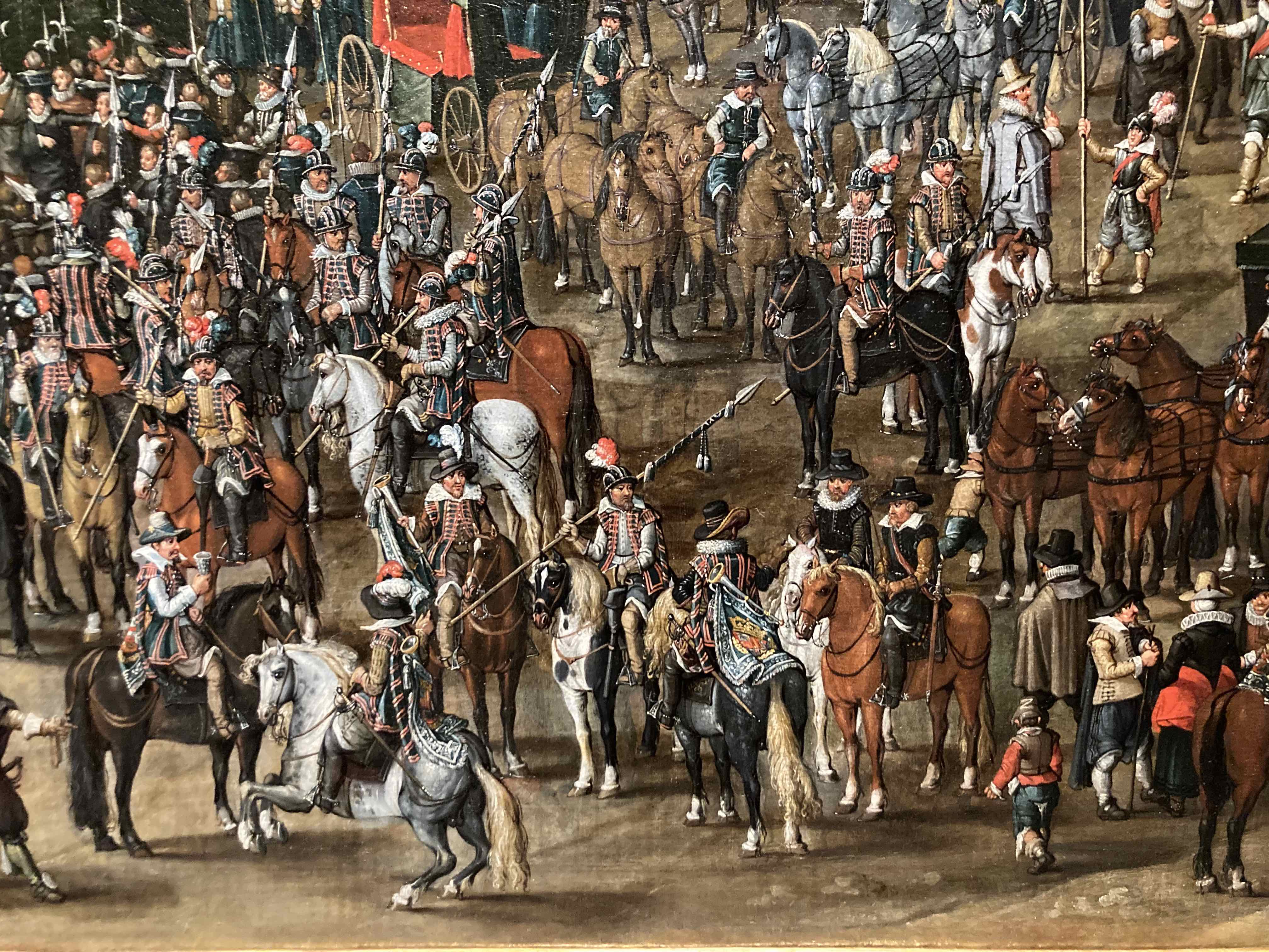 animal sounds , sound of the water , bustle in the street , street music , military music , musket salute , country party , Isabel Clara Eugenia of Austria , Albert VII (Archduke of Austria) , military drum player , trumpets , wind players , music chapel , pipe and tabor , crowd