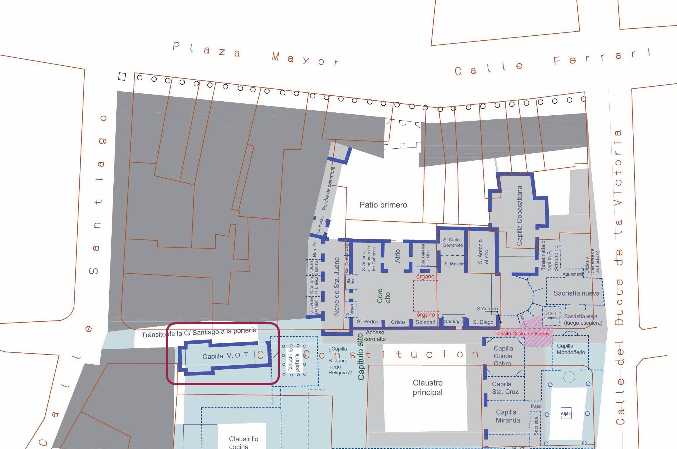 El acceso a la capilla se realizaba a través del muro de la epístola, por debajo del estrecho coro. En 1710, según relata Ventura Pérez en su Diario de Valladolid, durante las fiestas del octavario de la Inmaculada, un incendió acabó con el retablo mayor y con los retablos colaterales: “llegó a derretirse el órgano, quedó toda la capilla negrísima, se quemó hasta la forma consagrada, cosa que causó gran dolor”.