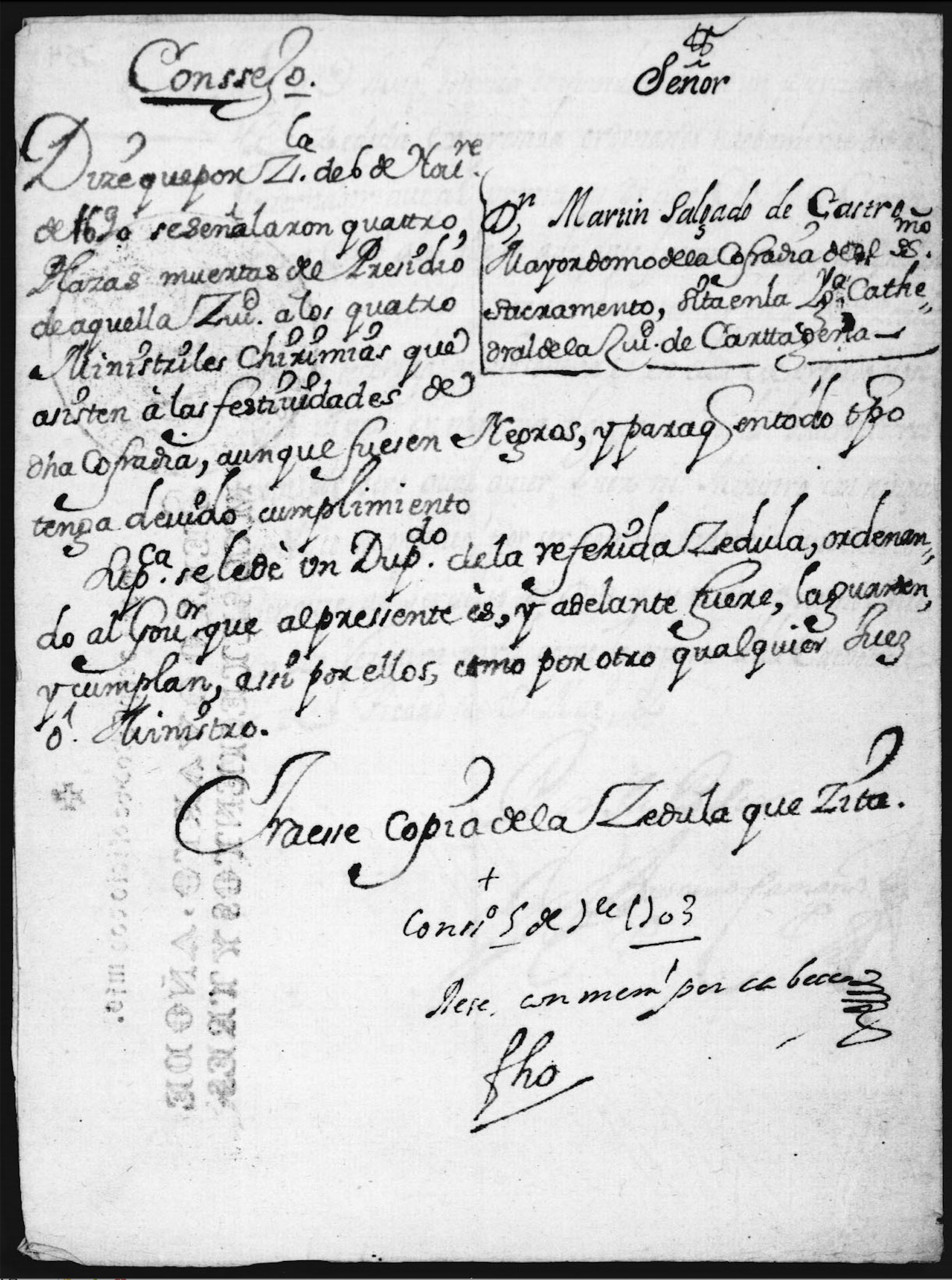 En 1703, Martín Salgado de Castro, vecino de la ciudad de Cartagena de Indias y mayordomo de la cofradía del Santísimo Sacramento, que tenía su sede en la catedral de Santa Catalina de Alejandría de esa ciudad, solicita al Consejo un “duplicado” de la citada cédula de 1690. En esa solicitud, indica que su padre y su abuelo habían sido también mayordomos de esa cofradía, “reedificando a su costa la capilla que dicha cofradía tiene en dicha santa iglesia”.