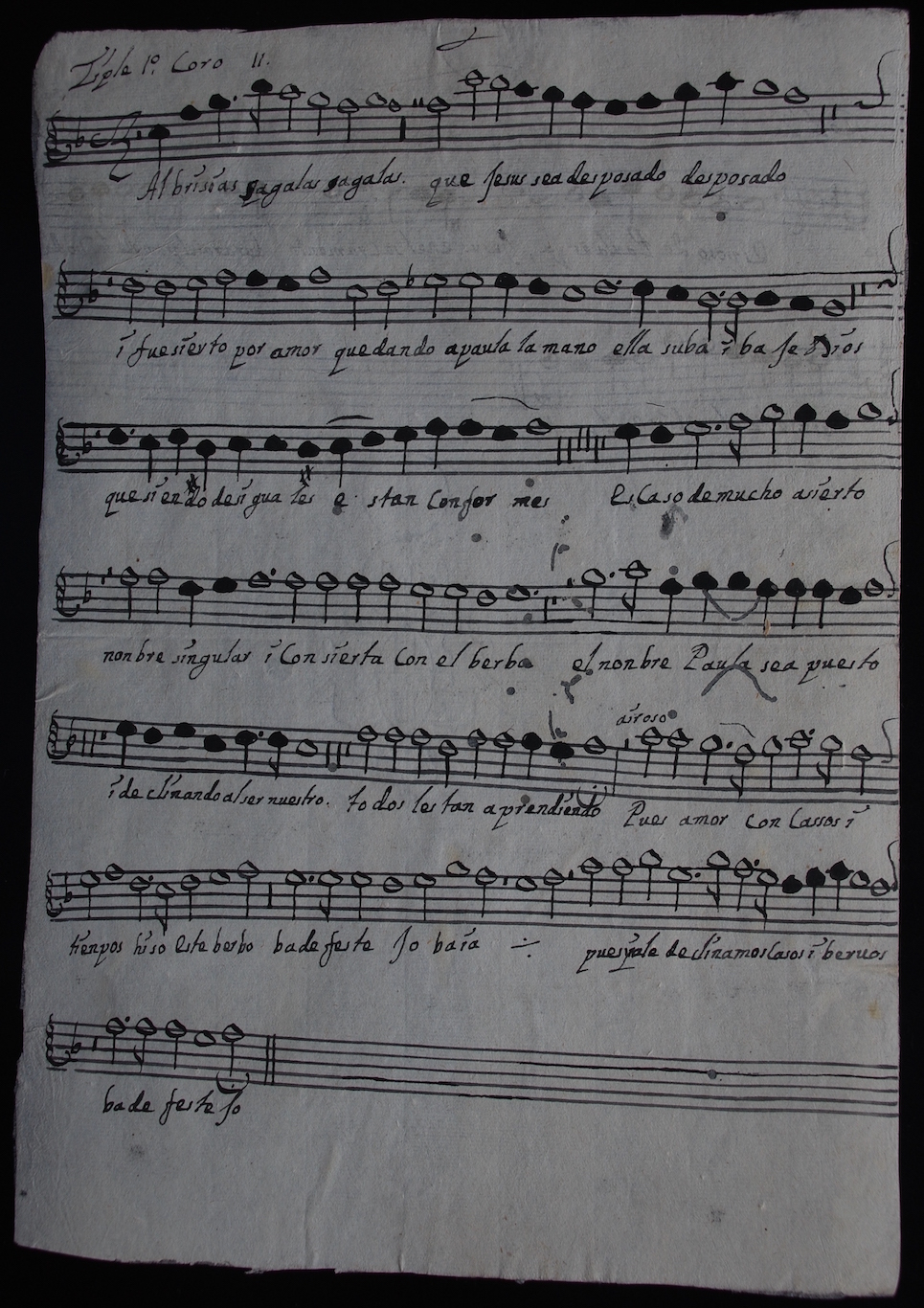 El otro villancico, también anónimo, es Albricias, zagalas, para la profesión de una monja llamada Paula. Según la indicación en el epígrafe de cada parte, es a 11 voces, de las cuales solo se conservan un tiple, un tenor (con la indicación “violón”) y un bajo. En la única copla, que figura en la parte de tiple, se menciona el nombre de la profesa: