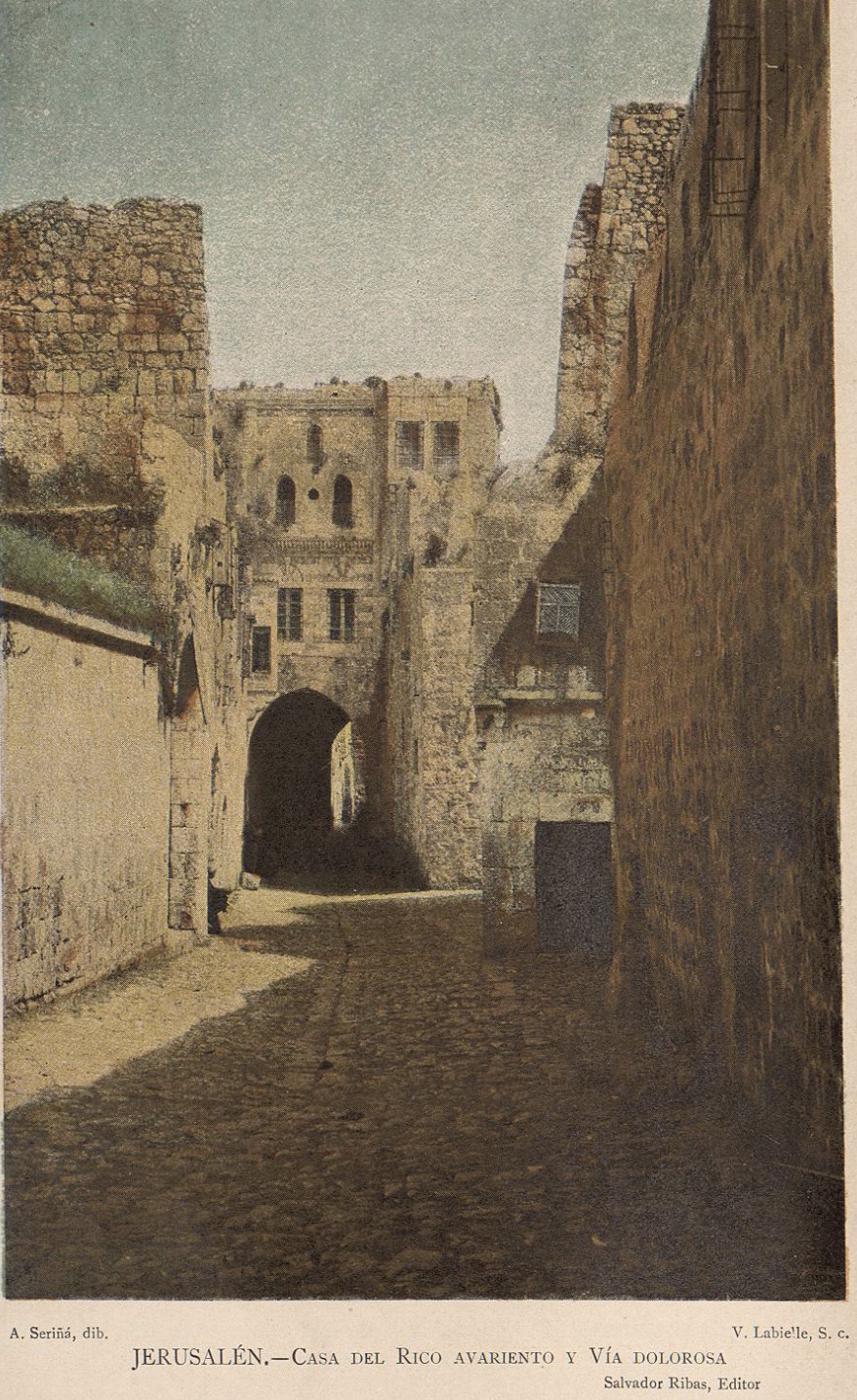 La siguiente alusión es a la casa del “rico avariento que no quiso dar al pobre Lázaro de sus migajas”, que se encontraba en la misma calle (n.º 15). La parábola del hombre rico, “Epulón”, y el mendigo, “Lazaro”, es recogida únicamente por San Lucas (16, 19-31).