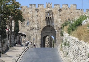 Finalmente, el grupo de peregrinos atravesó la puerta de San Esteban (n.º 2, saliendo extramuros: “bajando como sesenta pasos está una señal de muchas piedras donde fue una iglesia en el lugar donde fue apedreado” (n.º 41).