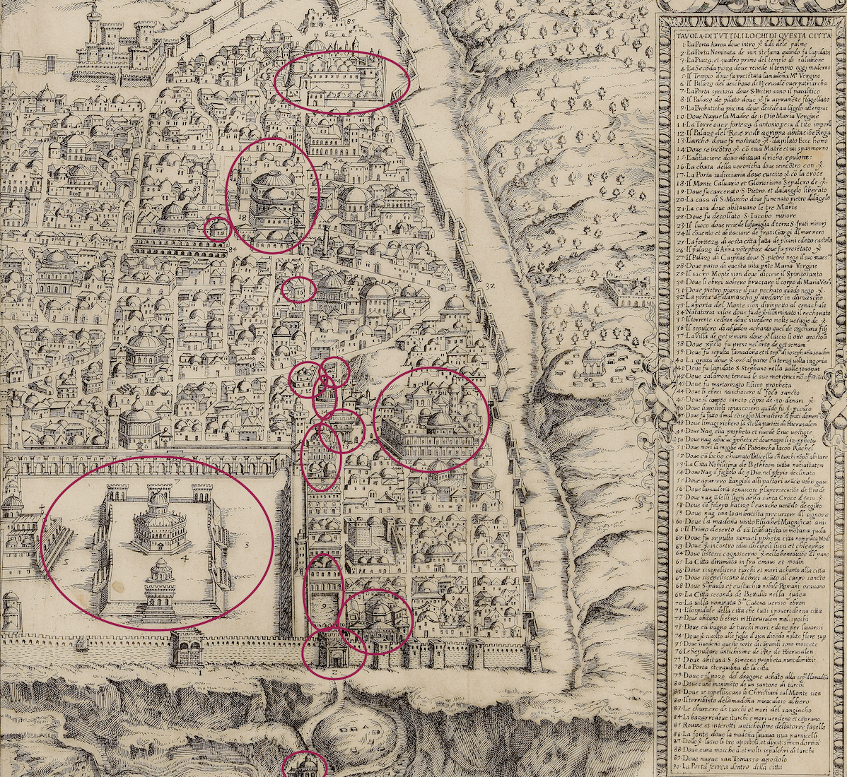 El día 24 de septiembre, Francisco Guerrero y su discípulo Francisco Sánchez, probablemente acompañados del mismo grupo de peregrinos y franciscanos que en la anterior jornada, visitaron las estaciones de la Vía Dolorosa: “que son las calles por donde Christo fue a morir, llevando la cruz a cuestas, desde la casa de Pilato hasta el Calvario”. De nuevo, el mapa del franciscano Agostino de Angelis (1578), contemporáneo de la visita del compositor a la ciudad, nos ayuda en la localización y georreferenciación de los lugares que este nos indica en su relato (ver recurso).