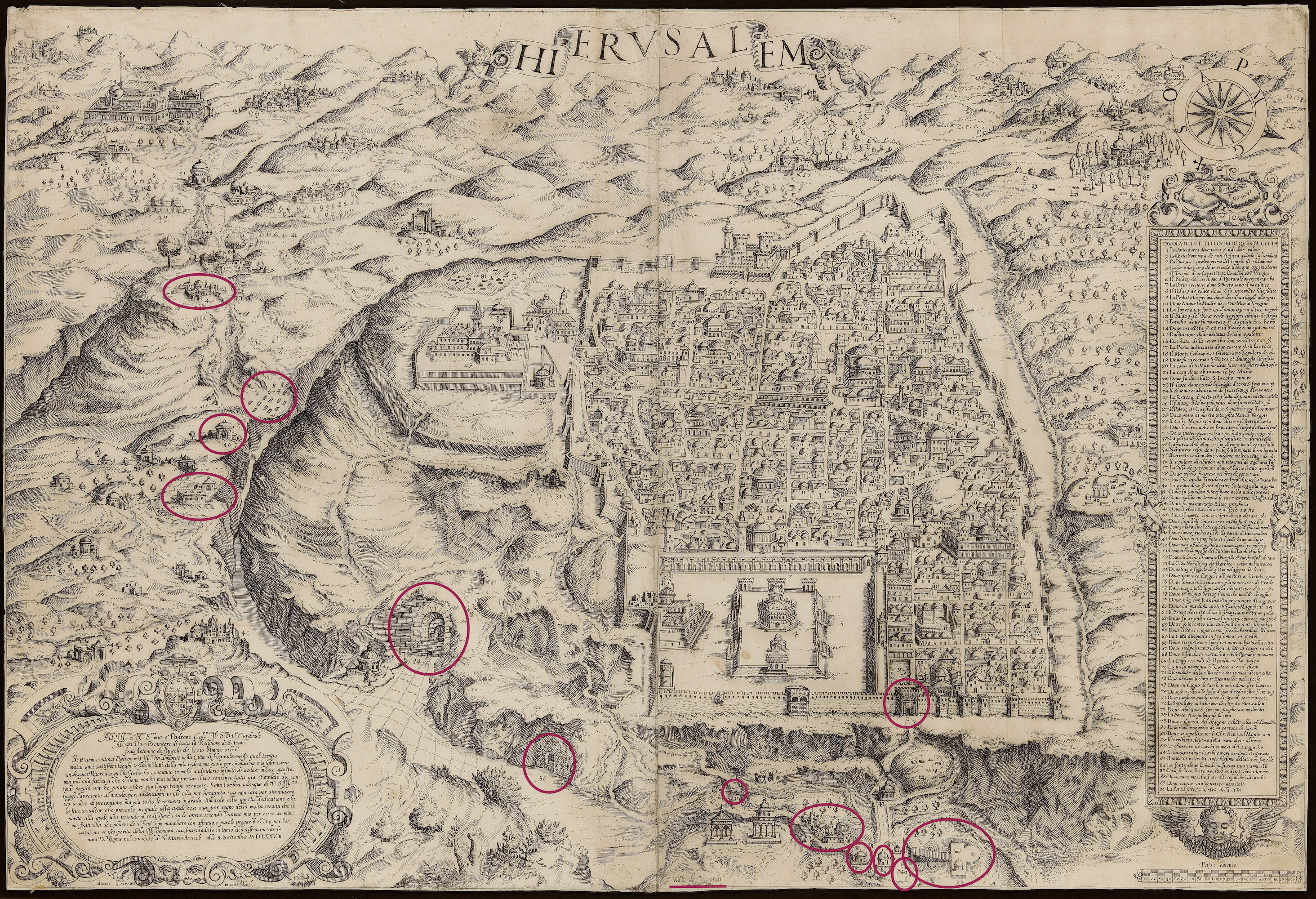 El mapa del franciscano Agostino de Angelis (1578), contemporáneo de la visita del compositor a la ciudad, una vez más, nos ayuda en la localización y georreferenciación de los lugares que este nos indica en su relato y, en este caso, nos proporciona una imagen que puede ayudarnos a entender mejor la descripción hecha por Guerrero (n.º 39, ver recurso).