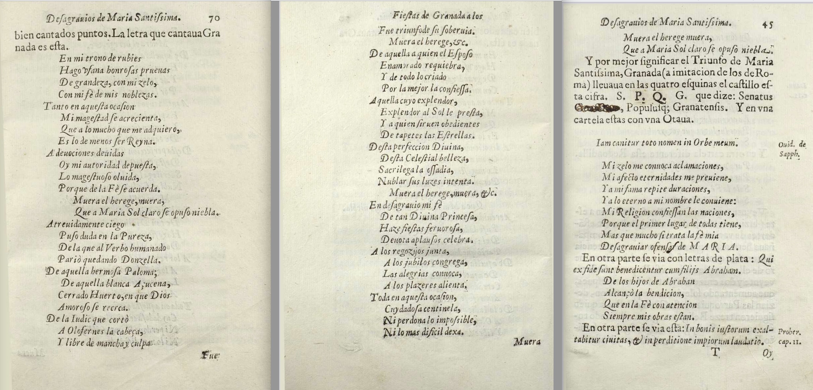 On 13th May 1640, a general procession was held in Granada, in addition to the processions that had already taken place, as an act of atonement for the dfor the libel placed on the corner of the Town Hall against the Virgin Mary on 5 April, during the night of Maundy Thursday. To complement the events of that day, elevated stages were set up in the Campo del Triunfo, where two autos sacramentales were performed by Antonio Prado's company: La hidalga del valle by Pedro Calderón de la Barca and El hereje: Auto en alegoría del sacrílego y detractable cartel que se puso en la ciudad de Granada contra la Ley de Dios y su Madre Santísima by Álvaro Cubillo de Aragón, a local author who wrote it specifically for the occasion “in three days”.