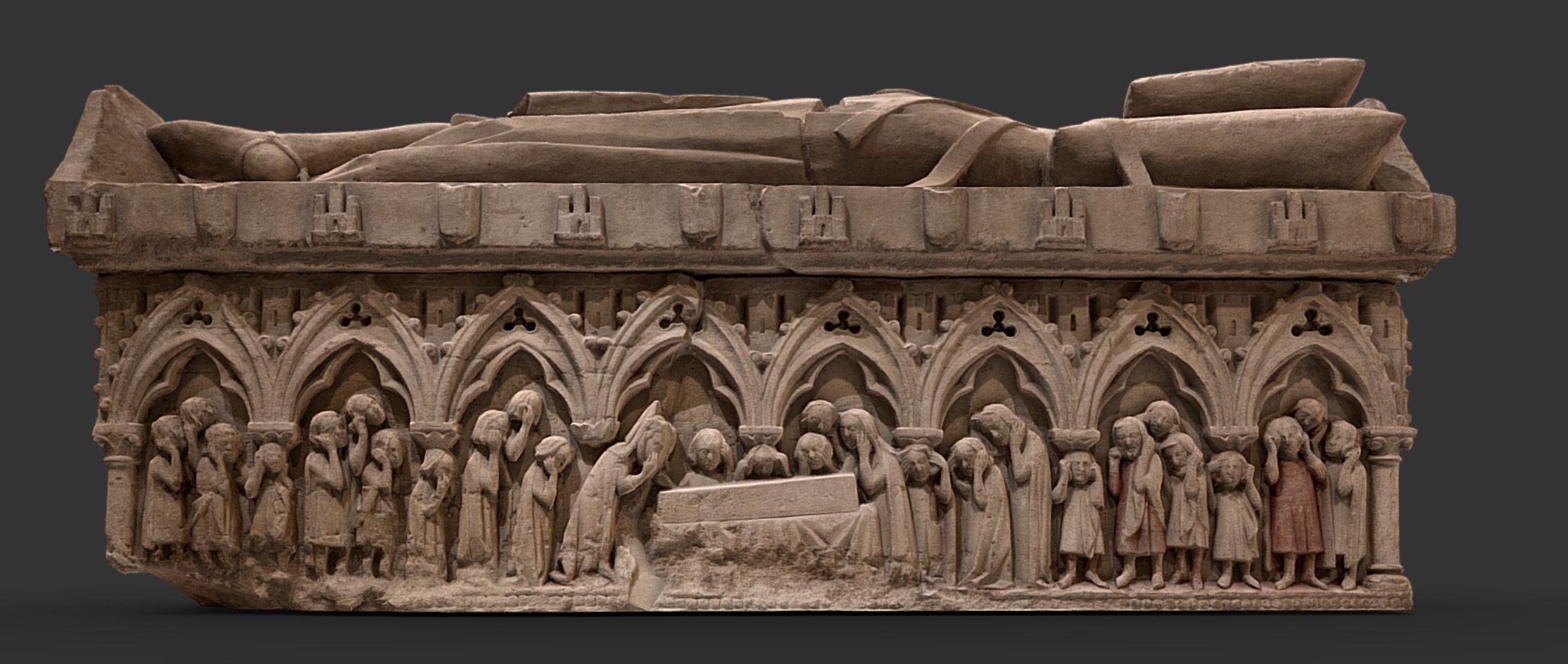 “[Ley C] Que pena han segunt santa eglesia los que facen duelos desaguisados por los muertos: Más los duelos que facen los homes en que se mesan los cabellos, o se rompen las caras et las desafiguran, o se fieren de guisa que vengan a lisión o a muerte, segunt deximos en la ley ante desta, esos duelos son malos porque se face con desesperamiento e con crueza. Et por ende tovieron por bien los santos padres que los que desta guisa lo feciesen que non les diesen los clérigos los sacramentos de santa iglesia, nin los cogiesen en ella cuando obiesen de decir las horas fasta que fuesen sanos de las mesaduras o de los rascaños o de las otras feridas o males que obiesen fecho… Otrosi mandaron por esta razón mesma que cuando los clérigos aduxiesen la cruz a la casa onde el muerto estodiese, et oyesen que facían ruido dando voces por el home, o endechando, que se tornasen con ella et nos la metiesen ahí onde tales duelos feciesen. Eso mesmo decimos cuando toviesen el cuerpo del muerto en la eglesia, que non deben llorar nin dar voces porque se estorben de decir las horas, ca en aquella sazón todos deben callar et rogar a Dios por los muertos que les haya merced a las almas…”.