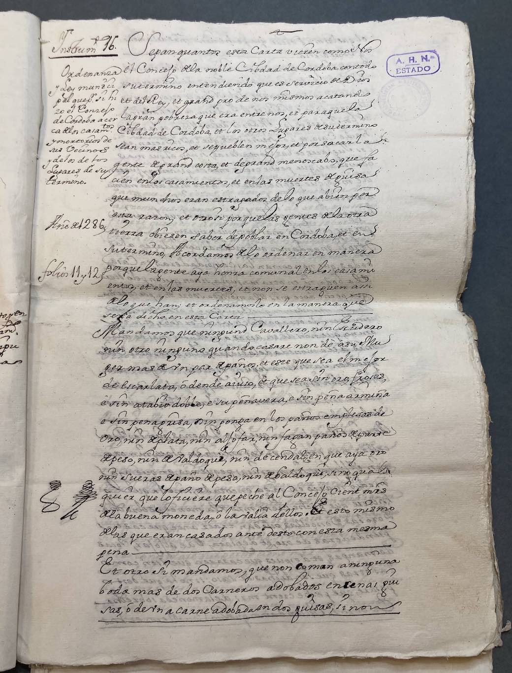 En el Archivo Histórico Nacional se conserva el traslado de un documento del Archivo Municipal de Córdoba fechado el 10 de febrero de 1286 (era 1324), el cual se efectuó el 10 de julio de 1751 (el documento original se encuentra en ese archivo, Tumbo de privilegios, fols 11r-12v). Se trata de una ordenanza hecha por el Concejo de Córdoba sobre los casamientos y defunciones de los vecinos de la ciudad y de su término. La justificación dada por el Concejo para establecer esta normativa: