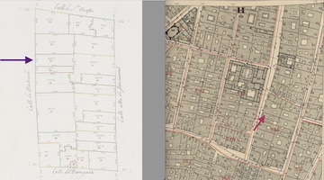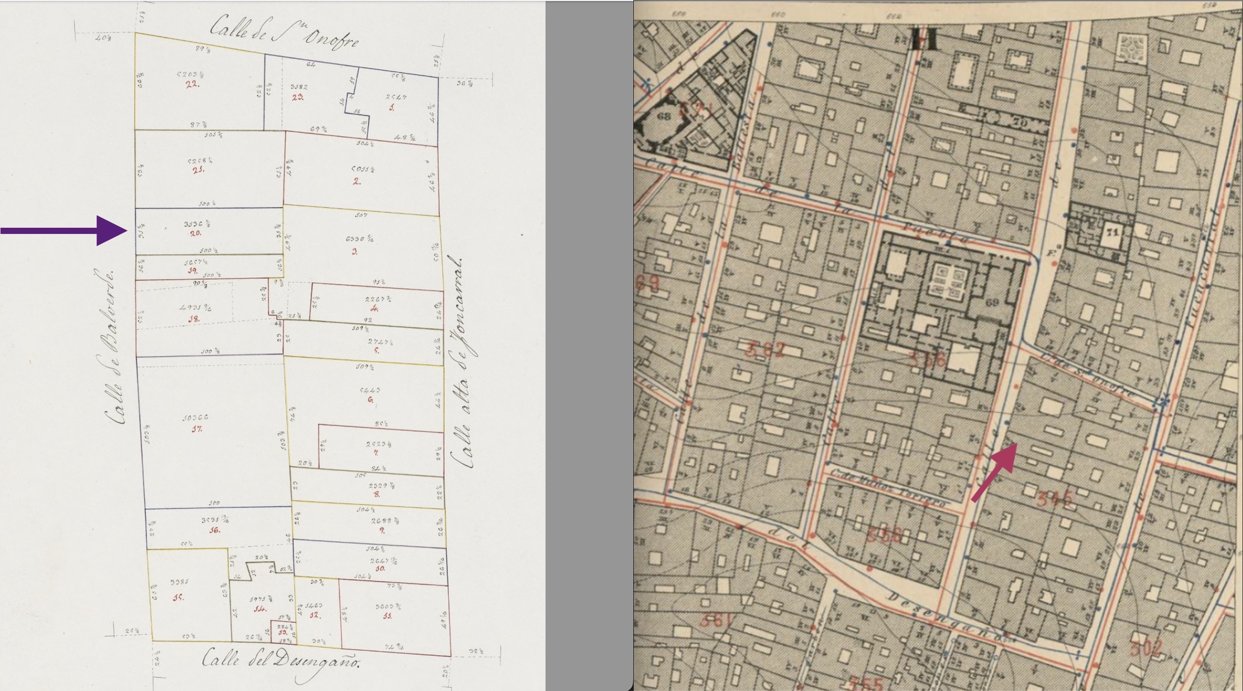 He localizado un documento que hace relación a la casa en la que vivía Domingo Oliveri y su mujer, en el número 40 de la mazana 345 de la calle de Velarde. El 18 de marzo de 1780, Antonio Agustín Gamito, probablemente suegro de Alfonso García Jiménez, solicitaba permiso para construir “un cuarto segundo en su casa propia que habita en la calle de Valverde, n.º 20, manzana 345”. A finales del siglo XIX, los números de esta calle eran correlativos, por lo que se encontraba al lado de los números 21 y 22. Un segundo documento de 26 de agosto de 1794, en el que Antonio Rivera solicita demoler esas casas para construir otra de nueva planta, dice que linda con el “tranquero de piedra berroqueña en la contigua posesión n.º 20”. El linde de la casa n.º 22 llegaba hasta la esquina de la calle Onofre, donde empezaba la manzana 346. Esto nos permite situar con bastante precisión la ubicación de la residencia de Oliveri en la Planimetría General de Madrid (1750-1751) y en el Plano Parcelario de Madrid de 1874 (ver recurso).