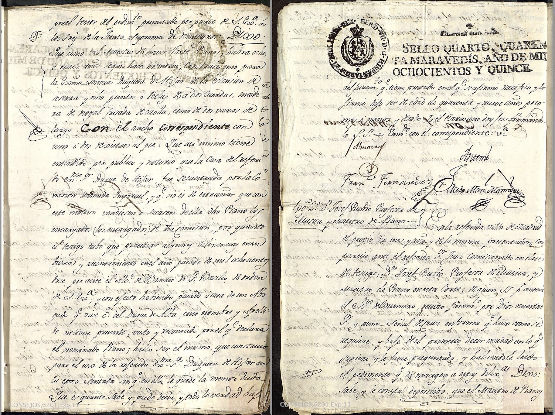 “Que como tal maestro de hacer fortepianos, habrá ocho o nueve años, según hace memoria, construyó uno para la Excma. Sra. duquesa de Híjar, de la extensión de sesenta y ocho puntos o teclas, de a dos cuerdas, madera de nogal frisada de caoba, como de dos varas de largo [aproximadamente 167 cm], con el ancho correspondiente, con uno o dos registros al pie. Que así mismo tiene entendido por público y notorio que la casa del referido Excmo. Sr. duque de Híjar fue secuestrada por la Comisión llamada Imperial y que no es de extrañar que con este motivo vendiesen o sacasen de ella dicho piano los encargados de dicha Comisión, por cuanto el testigo tuvo que practicar algunas diligencias en su busca y reconocimiento en el año pasado de mil ochocientos doce, por ante el dicho alcalde de barrio de San Basilio de orden de su Excma., y con efecto, habiendo pasado a casa de un abogado que vive calle del Duque de Alba, cuyo nombre y apellido no tiene presente, visto y reconocido por el que declara el nominado piano, halló ser el mismo que construyó para el uso de la referida Excma. duquesa de Híjar en la época sentada, sin que en ello le quede la menor duda”.