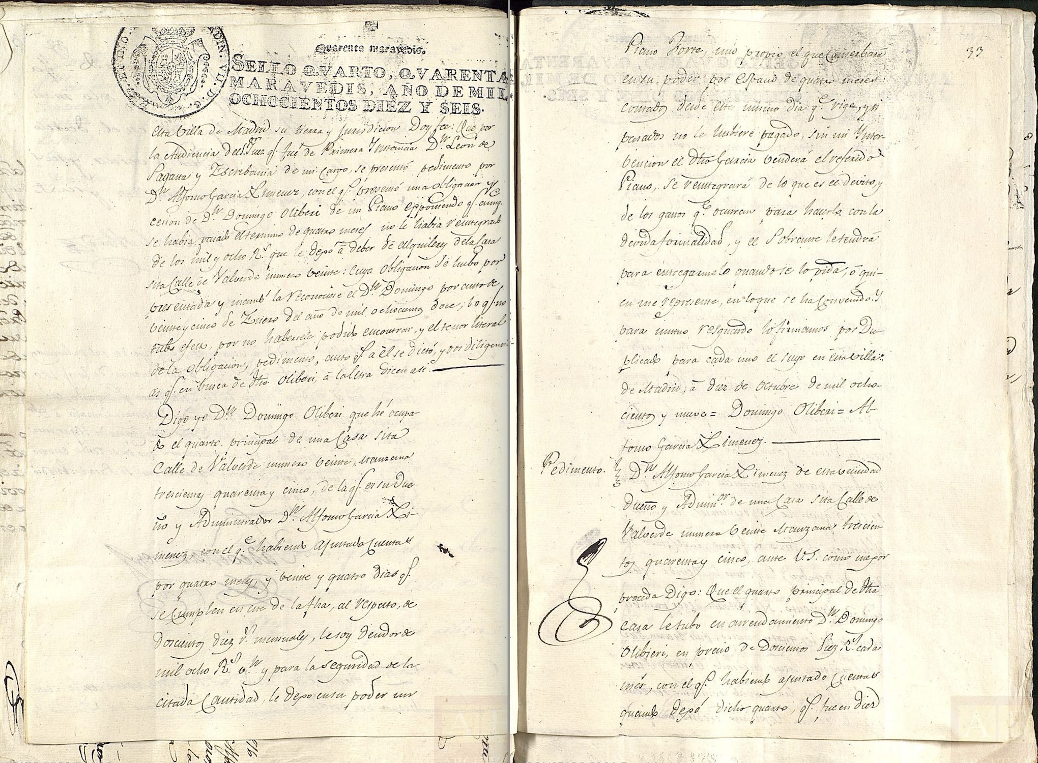 En este punto, la disputa entre las partes se enconó, reclamando Ventura González que los testigos del duque habían probado que el piano era suyo y debía devolvérsele sin más dilación. El procurador Antonio Lumbreras siguió presentado documentos que ratificaban que García Jiménez había recibido el fortepiano en pago de los alquileres que le debía el músico italiano Domingo Oliveri. De esta documentación se extrae también otra información de interés. En uno de esos escritos, se certificaba la obligación y cesión que Domingo Oliveri hacía de un pianoforte por la deuda contraída con García Jiménez del alquiler de cuatro meses y veinticuatro días de la vivienda citada, el cual ascendía a 1.008 reales (a razón de 210 reales mensuales). El reconocimiento de deuda por parte de Oliveri estaba fechado 10 de octubre de 1809. El piano se cedía en calidad de fianza. Si pasados cuatro meses no se había abonado la deuda, García Jiménez debía venderlo y, descontados los gastos de esa venta y su deuda, devolverle lo que sobrara. Oliveri abandonó el cuarto de la casa de la calle de Velarde ese mismo día. Desde ese momento, Oliveri no había abonado la cantidad adeudada, aunque se le había reconvenido numerosas veces, excepto en los últimos tiempos “por no saber su paradero”. Un auto, fechado el 25 de enero de 1812, señala que debía efectuarse la tasación del pianoforte por un perito para proceder a su venta, para lo cual se señala que debía anunciarse en el “Diario”, en alusión al Diario de Madrid. Las averiguaciones llevadas a cabo en Madrid para determinar el paradero de Oliveri, en febrero de 1812, resultaron infructuosas.