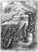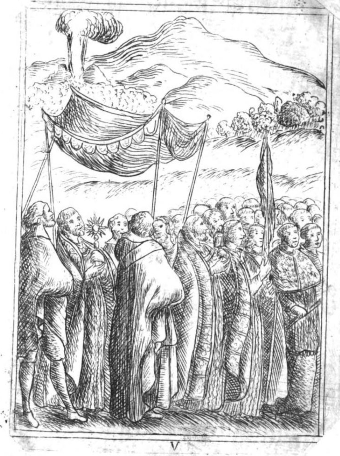 El lunes, día 18 de marzo, salió de la ciudad el senado y el obispo acompañados de todo el clero, ordenes religiosas y un gran número de cofradías, con antorchas en las manos para conjurar el fuego, de nuevo con el velo de la santa que se quedó en la iglesia del monasterio de San Benedetto, de donde salió procesionalmente en su caja hasta un altar que se había levantado en medio del campo, lugar en el que se oficio una misa y, finalizada esta, un nuevo exorcismo. Al enarbolar el velo de la santa, dice la crónica, no cesaron los horribles estruendos que sonaban como si se hubieran disparado muchas piezas de artillería, asociando todos los signos a la obra del maligno.