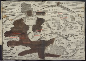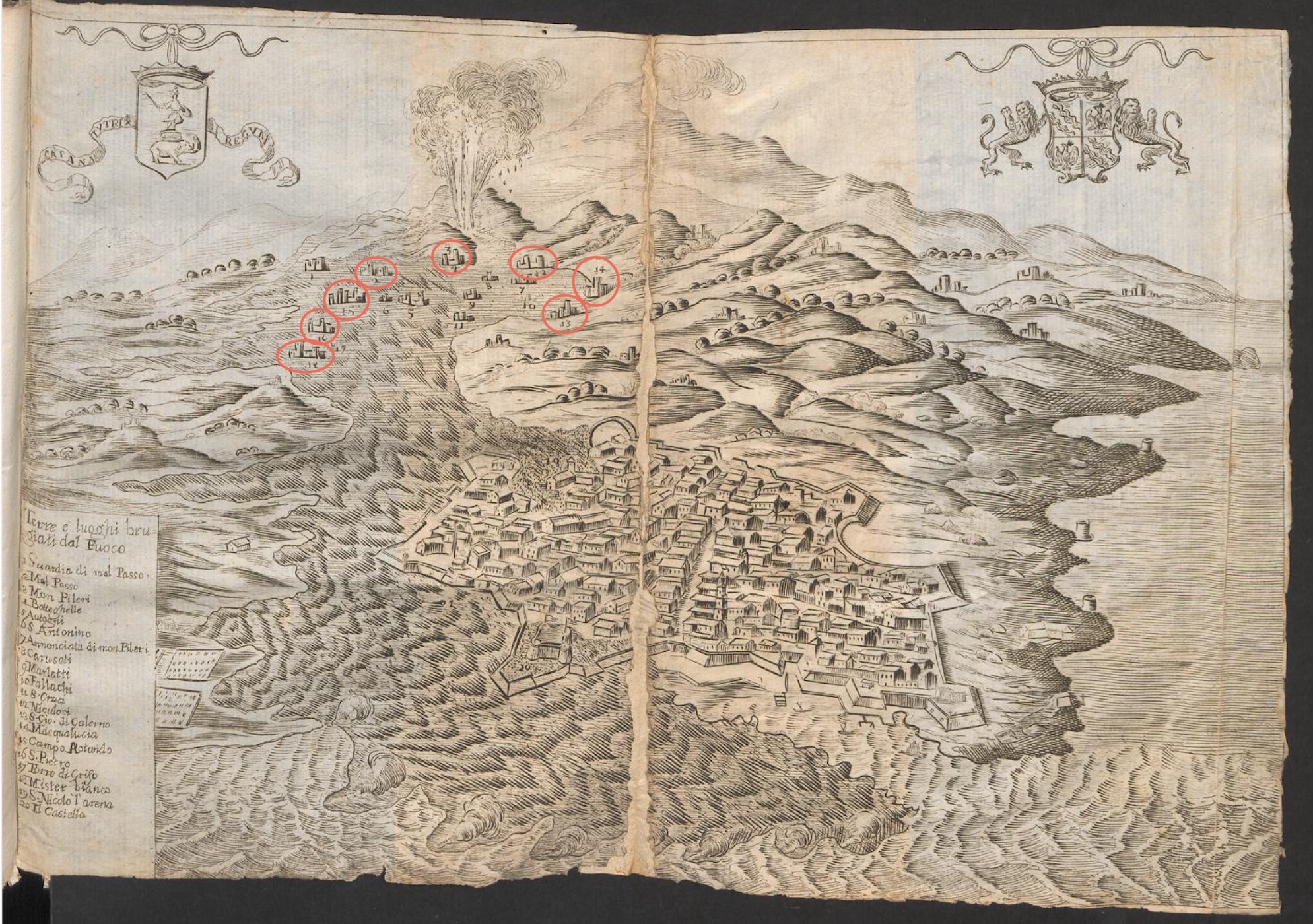 Siguiendo la narración cronológica de ambas crónicas, iré desgranando las distintas procesiones de rogativas que se efectuaron invocando la protección divina, en las que el poder taumatúrgico de las reliquias de Santa Águeda, patrona de la ciudad de Catania, presentes en la mayor parte de ellas, no bastaron para evitar la destrucción generada por un volcán en el que la tradición cristiana localizaba la puerta del infierno. Los primeros signos de la erupción fueron el enorme estruendo y los terremotos que se iniciaron el viernes 8 de marzo de 1669 (el primero de los viernes de cuaresma). Afectó inicialmente a las localidades de la ladera del Etna más cercanas a las cumbres. En estas poblaciones se empezó a implorar el socorro divino con la exposición del Santísimo Sacramento en las puertas de las iglesias, ya que se temía por el derrumbe de sus edificios, y organizando numerosas procesiones “con grande penitencia & mortificação”. Expresamente se cita la que se hizo desde Malpasso a Nicolosi, uno de los lugares que quedó destruido, en la que llevaban una reliquia de Santa Lucía y en la que iban, según la crónica italiana, cinco mil personas, en hábito penitente y disciplinándose. Al llegar a la iglesia de Santa Maria della Misericordia del lugar de Portiguelle (= Botteguelle) y depositar la reliquia en el altar, sobrevino uno de los terremotos que abrió diversas grietas, “lançando no ar a gente da procissão” (ver recurso).