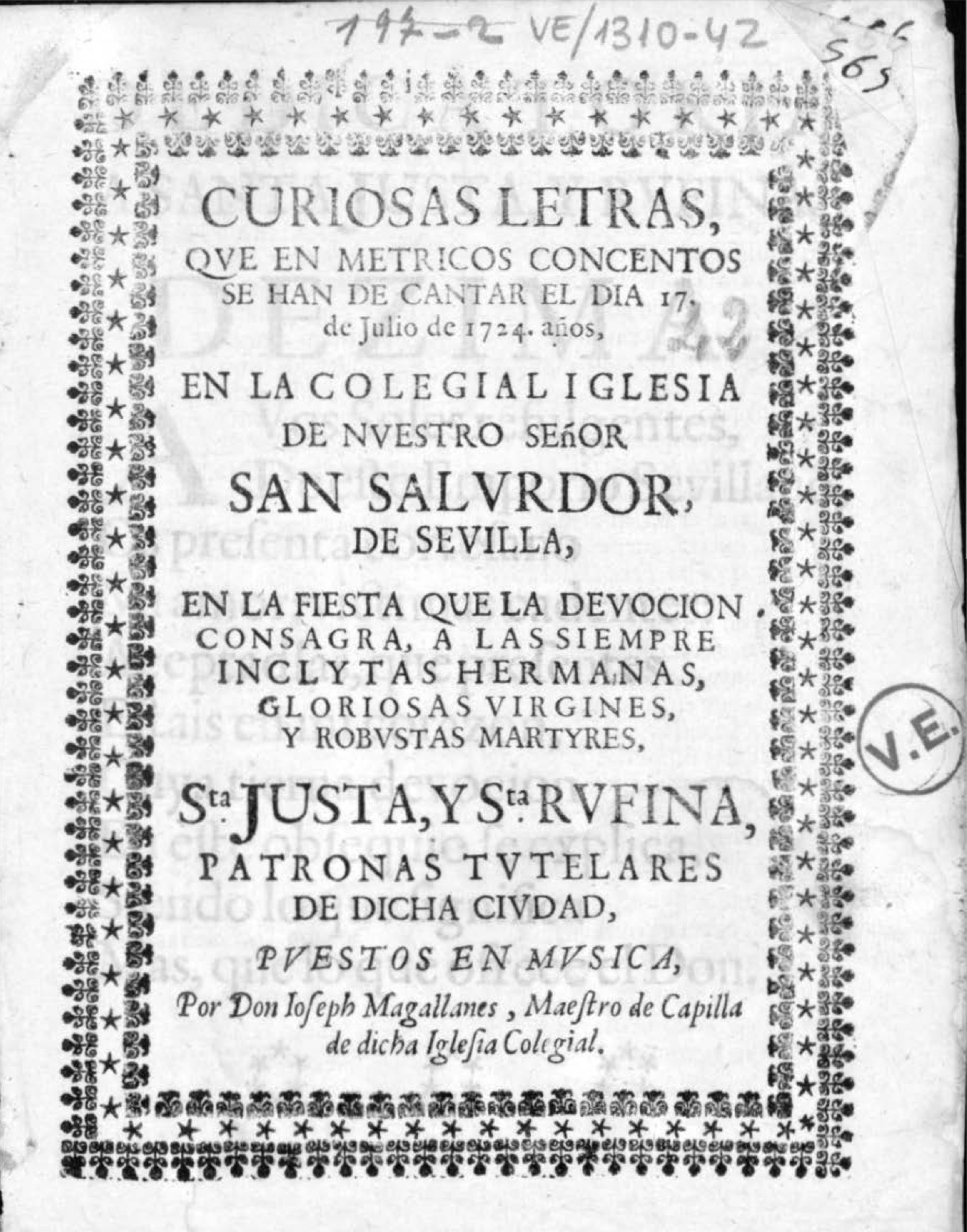feast of the Saints Justa and Rufina , Saints Justa and Rufina songs (villancicos) , Christmas song (villancico) , José de Magallanes (composer, chapel master) , music chapel of the collegiate church of San Salvador (Seville) , music chapel of the cathedral , city council