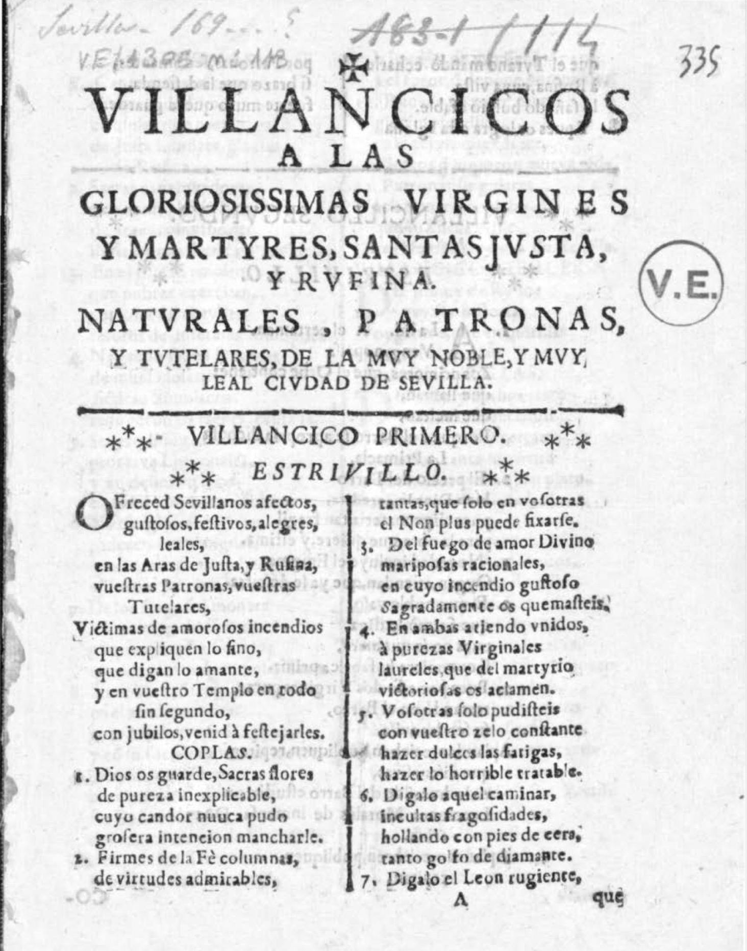 * Villancico Primero. Estribillo: “Ofreced sevillanos afectos” / Coplas: “Dios os guarde, sacras flores”.