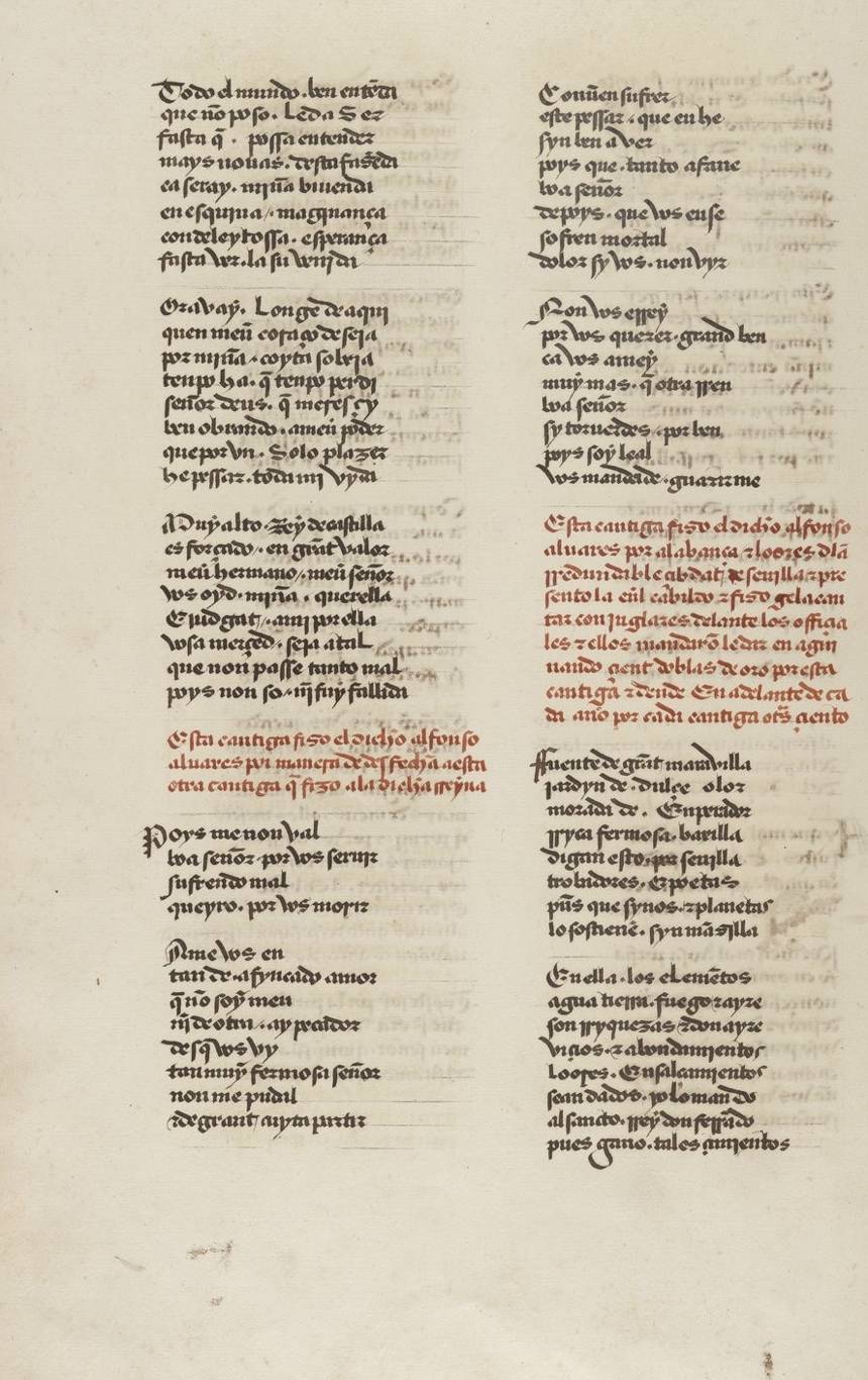 “Esta cantiga fiso el dicho Alfonso Álvarez por alabanza e loores de la redundible cibdat de Sevilla e presentola en el cabildo e fisogela cantar con juglares delante de los oficiales e ellos mandaron le dar en aguinando cient doblas de oro por esta cantiga e dende en adelante de cada año por cada cantiga otros ciento”.