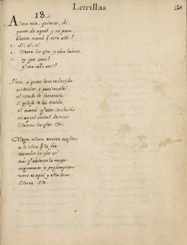 En la primera acotación del auto de Mira de Amescua se indica que los músicos salen vestidos “de galanes” y en esta primera escena cantarán “Ya no verán más mis ojos” (verso 111). Más adelante (verso 649), cantarán “La palabra del Padre” y después (verso 1105) “Pajarillos suaves”. El auto se cierra con una escena musical (verso 1219) en la que los músicos cantan junto con Celia, uno de los personajes principales de la obra, “Alma mía, quieres, di”. La primera estrofa de esta última canción procede de una de las letrillas de Luis de Góngora que se encuentra con la misma formulación en el Mss/2892 (fol. 124r) de la Biblioteca Nacional, salvo la omisión de la palabra Dios en el verso seis. En el manuscrito RES/45 V.2 de esta misma institucion, esta letrilla está en el grupo titulado “En la fiesta del Santísimo Sacramento” y el íncipit es “Alma niña, quieres di” y sí recoge la palabra Dios en el verso seis.