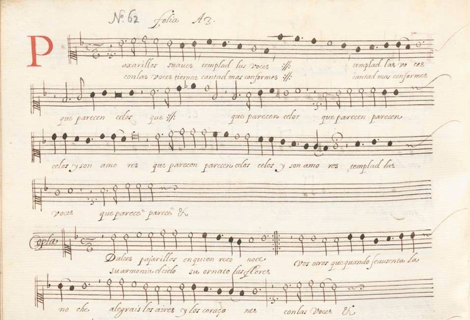 La canción “Pajarillos suaves” alcanzó una gran popularidad como pone de manifiesto su presencia, con pequeñas variantes textuales, en dos fuentes musicales relevantes para la música española del siglo XVII: el Cancionero de la Sablonara (n.º 65) y el Libro segundo de tonos y villancicos de Juan Arañés, pp. 20-21 (Roma: Giovanni Battista Robletti, 1624). En el primero se trata de la folia a 3 voces de Álvaro de los Ríos que mantiene el mismo íncipit “Pajarillos suaves”; en el segundo, “Avecillas suaves”, también a 3 voces, calificada como “Villanella espannola”, Arañes establece un contraste entre el estribillo, unas seguidillas en ritmo ternario, con las coplas que escribe en ritmo binario. Agradezco a Sebastián Mariño León el que me haya puesto en la pista de esta última fuente en la revisión de este artículo.