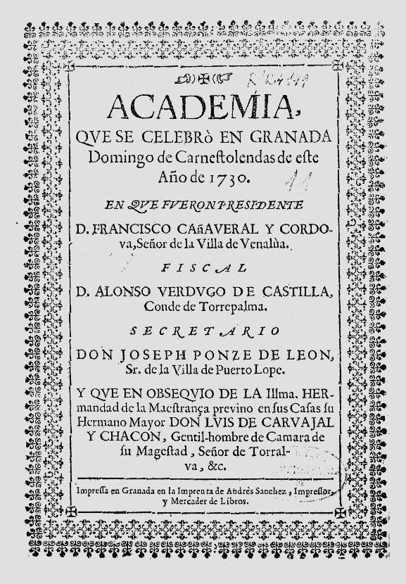 On February 19, 1730, Luis de Carvajal y Chacón organized an academy in honor of the Real Maestranza de Granada in his private residence. In this event, as usual, music played a prominent role, with interpretations of vocal and instrumental works that were alternated with the reading of different literary texts.