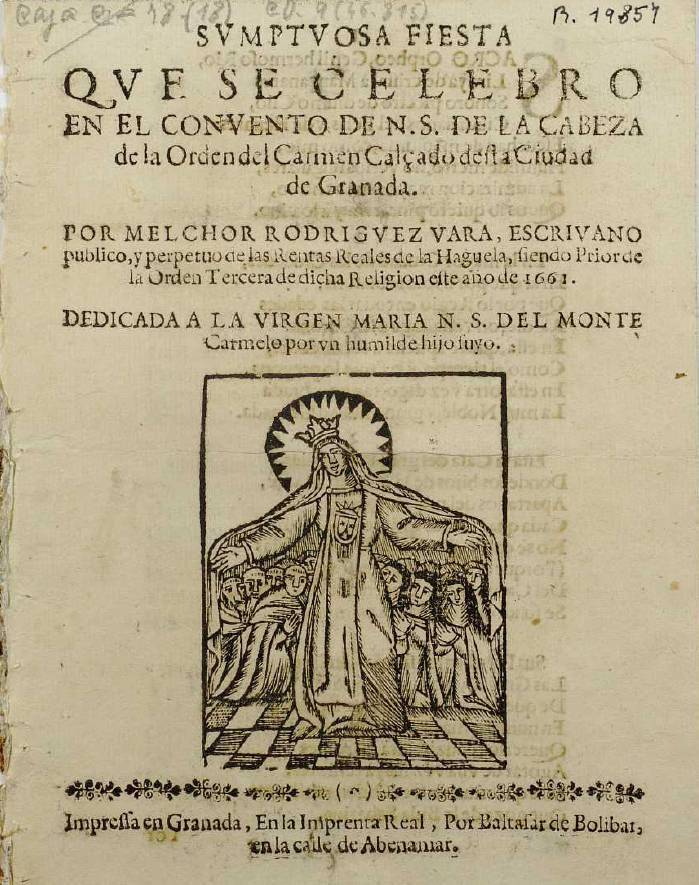 El texto en verso de Melchor Rodríguez Vara, prior de la orden tercera del Carmen, publicado en un pliego granadino, impreso en la imprenta real por Sebastián de Bolívar, nos permite acercarnos a la foto fija de los pormenores de la fiesta tal y como se celebró en 1661: