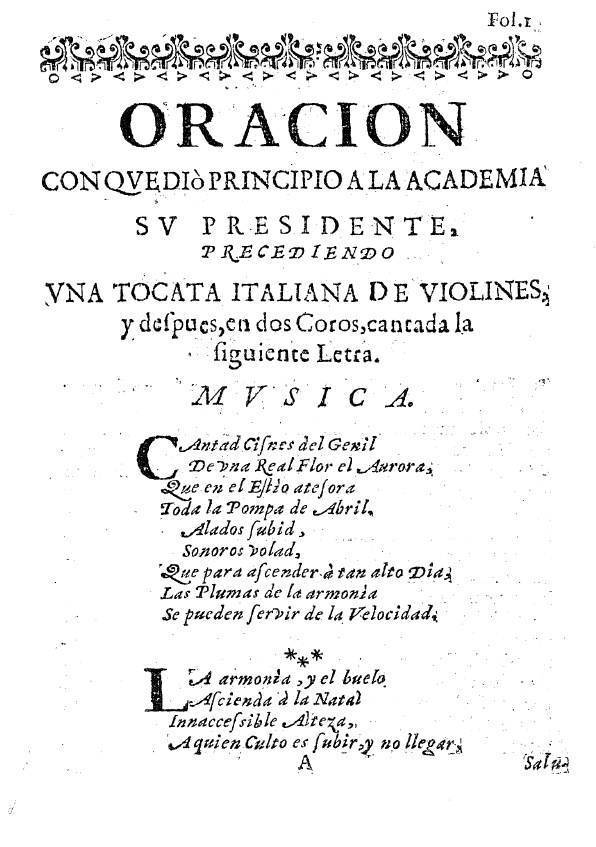 La academia se inició con “una tocata italiana de violines y después, en dos coros, cantada la siguiente letra”: Cantad cisnes del Genil. Como era habitual, se interpretaron, intercaladas entre los distintos “asuntos”, diferentes obras con textos alusivos al evento que había propiciado la academia: