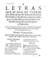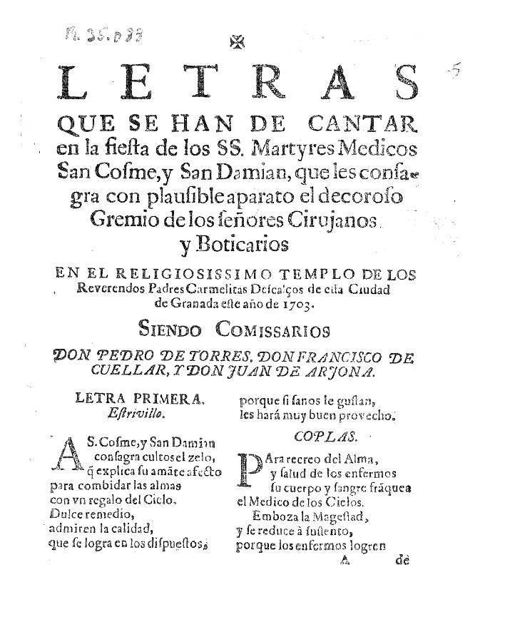 Un pleito del convento de carmelitas descalzos de los Mártires San Cosme y San Damián con el gremio de boticarios y cirujanos de Granada sobre la la fiesta anual de esos titulares nos proporciona una interesante información (A.H.N., leg. 15834, pieza 6). Esta fiesta se celebraba el 27 de septiembre con vísperas, misa cantada con sermón y procesión. Desde 1653 a 1718, la fiesta estaba a cargo del gremio de boticarios y cirujanos, pero ese año se retiraron y la subrogaron los maestros sangradores, los cuales fundaron una Hermandad con esa advocacion. El año 1719 se celebró “con toda solemnidad, con música”. Se han conservado los textos de los villancicos compuestos para la fiesta del año 1703, sin que se especifique el compositor de la música ni la capilla responsable de cantarlos. De los cuatro villancicos merece especial atención el cuarto, Ay que el amor, “solo con violines”, ya que si, como era habitual, fue una de las tres capillas musicales que en esas fechas había en la ciudad la encargada de su interpretación, es la noticia más temprana que tenemos a la presencia en ellas del violín.