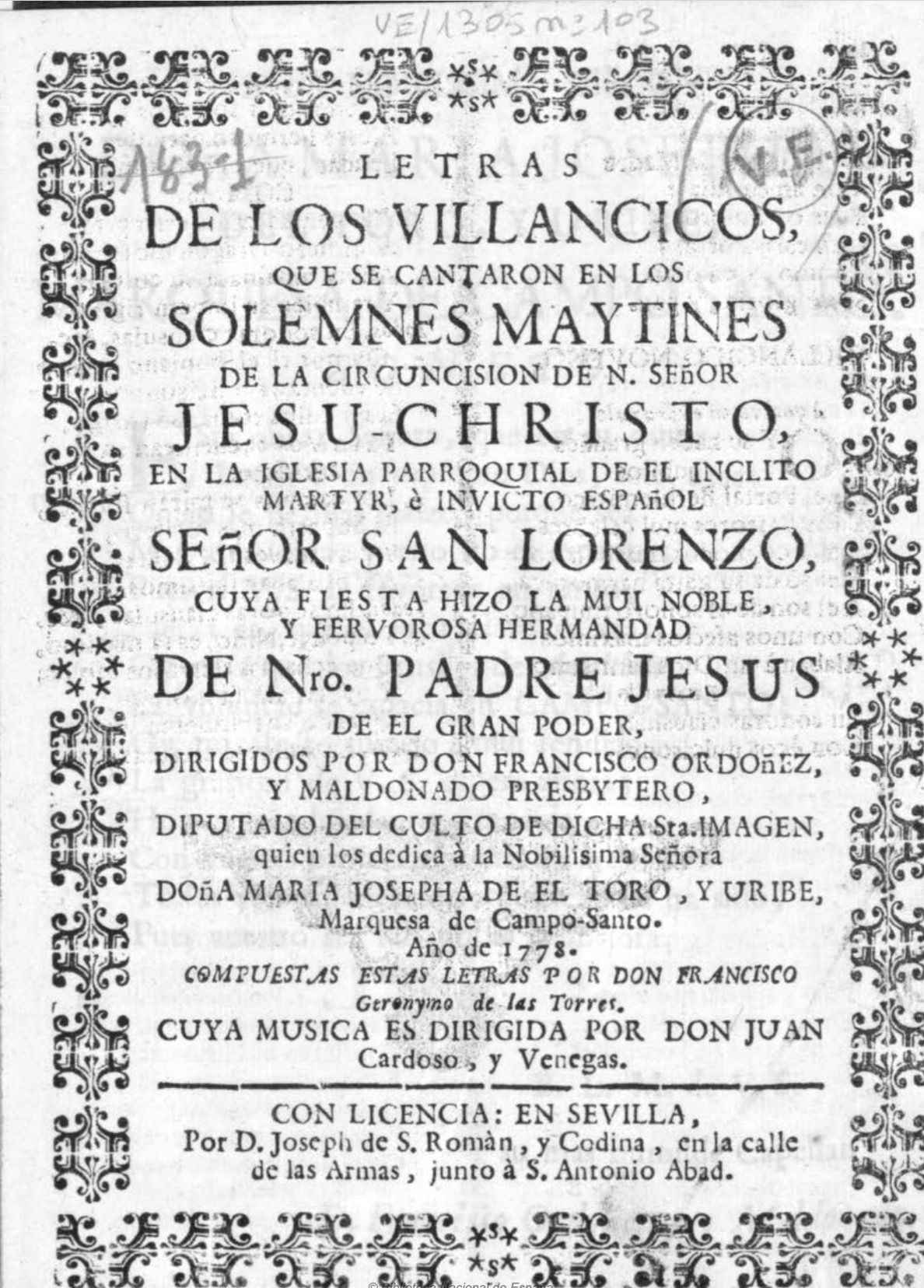La ciudad de Sevilla posiblemente sea la que generó el mayor número de villancicos para ser interpretados en un amplio elenco de festividades y de instituciones sacras. El 1 de enero de 1778, la hermandad de Nuestro Padre Jesús del Gran Poder celebraba en su sede, la parroquia de San Lorenzo, los maitines de la festividad de la Circuncisión de Jesús. Para la ocasión se cantaron nueve villancicos cuyos textos eran de Francisco Gerónimo de las Torres, dirigidos por Juan Cardoso y Venegas que no se especifica si fue el autor de la música. Es muy probable que lo fuera, ya que encontramos a Adulfo Juan Cardoso y Venegas como compositor en los pliegos de villancicos (“métricas consonancias”) de los Maitines de Navidad que se cantaron en la iglesia parroquial de la Asunción de Écija (Sevilla) en 1805 y en una fecha cercana sin identificar, ambos conservados en la Biblioteca Nacional.