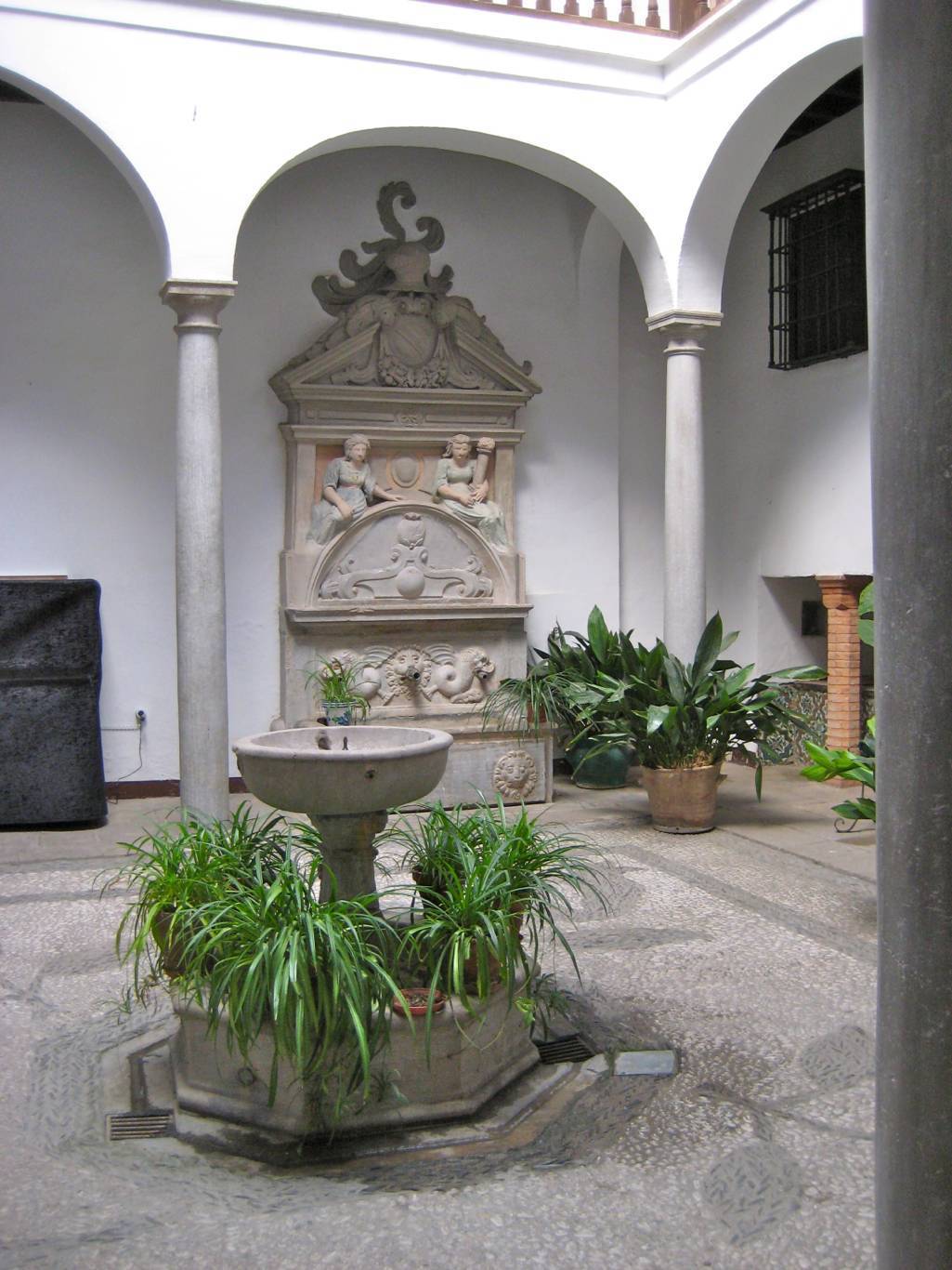 El patio principal de la casa es cuadrado y peristilado con arcos carpaneles sobre columnas tocanas también de piedra de Sierra Elvira. En el centro encontramos una fuente con una base octogonal, con molduras redondeadas en los extremos, fuste abalaustrado, taza lisa (de media naranja) y cuatro caños de agua en el borde.