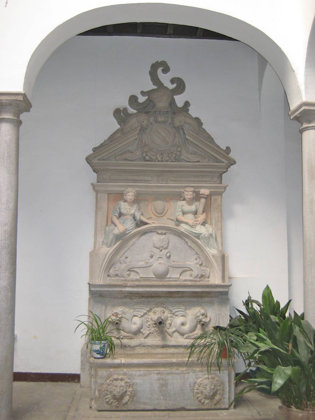 El elemento más destacado en este patio es, precisamente, el magnífico pilar que se encuentra adosado al lateral noroeste. La pila, de escasa altura, presenta como decoración dos cabezas de león, pero lo que destaca en ella es el espectacular frontal, dividido en dos pisos y rematado por un frontón triangular roto por el escudo de la familia. El agua mana por un único caño situado en la boca de un león, flanqueado por dos dragones alados. Una doble moldura separa el primer piso del segundo. En este, un arco de medio punto encierra una granada que se encuentra situada sobre una bola central. Sobre el arco se han dispuesto dos figuras femeninas, simétricas, la de la izquierda apoya su mano derecha sobre la clave del arco y con la otra se recoge el vestido. La de la derecha abraza una antorcha. Entre ambas hay un medallón ovalado. El escudo familiar que rompe el frontón triangular tiene una banda negra sobre campo de oro y tiene, debajo, la siguiente inscripción: “Don Francisco de Carvajal”. Se ha identificado este escudo con el de Francisco Carvajal y Manrique Salazar y Luna, corregidor de Granada en 1586, VI señor de Torrejón el Rubio y I conde de Torrejón (1602).