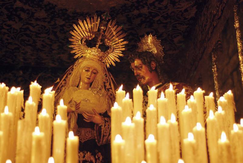 La primera imagen de devoción del cortejo, la del Nazareno, fue sustituida por la talla actual de Juan de Mesa y Velasco de 1620. Un inventario de 1618 señala que esa imagen primera era de candelero, solo con cabeza y manos y con pelo natural, la cual procesionaba sobre unas parihuelas. La imagen central ya contaba con las dos imágenes de la Virgen del Trapaso con San Juan Evangelista. La actual imagen de la virgen data de 1798, sin que se conozca su autoría; la de San Juan pertenece al mismo encargo realizado a Juan de Mesa en 1620. La última era un Cristo crucificado que fue sustituida en 1576 por una nueva efigie “de nueve palmos” contratada con el pintor sevillano Juan de Santamaría que recibió por ella doce ducados, más el crucificado antiguo.
