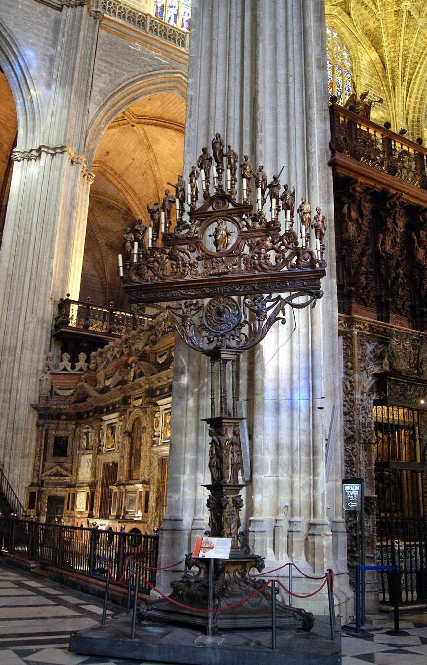 Una pieza fundamental en la liturgia del Oficio de tinieblas era el tenebrario. El de la catedral de Sevilla es uno de los más impresionantes que ha llegado hasta nuestros días. Mide 7.80 metros y fue construido entre 1559 y 1564. Su diseño se debe al arquitecto Hernán Ruiz, el Joven, y fue fundido por el rejero Pedro Delgado y el fundidor Bartolomé Morel. A los entalladores Juan Giralte y Juan Bautista Vázquez, el Viejo, y al policromador Juan Marín se deben las esculturas de madera que lo rematan y sirven de base a los cirios. Las velas se iban apagando al final de cada salmo (los nueve de los Maitines y los cinco de los Laudes) de forma alternativa a cada uno de los lados del tenebrario, empezando por el lado del Evangelio. La última vela, situada en la parte superior, se llamaba María y se retiraba del tenebrario una vez cantado el Benedictus. Al comenzar el Christus factus est, esta última vela se escondía, interpretándose el salmo Miserere a oscuras. Tras la oración Respice quaesumus sonaban las carracas y matracas y después se volvía a sacar la vela y se colocaba de nuevo en el Tenebrario dejándola arder algún tiempo.