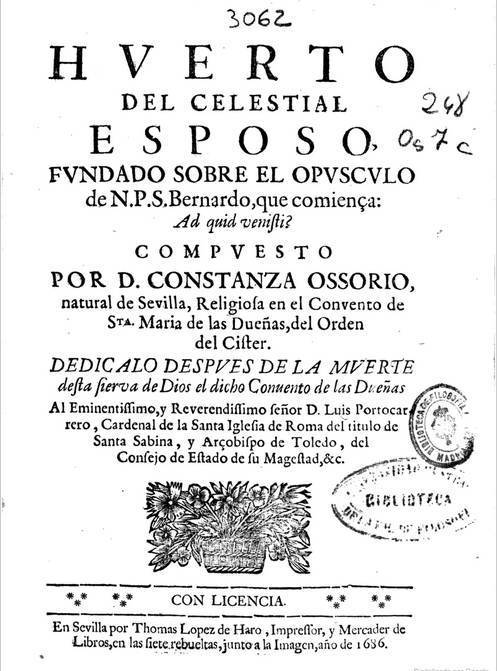 He podido documentar la capilla de música del desaparecido convento de Santa María de las Dueñas, en Sevilla, de manera indirecta, a través de la figura de la poetisa y música Constanza Osorio (1565-1637). Su perfil biográfico fue trazado, en 1686, por la abadesa de la comunidad Benita Levanto, la cual había sido novicia bajo la tutela de Constanza Osorio, para incluirlo en los preliminares a la impresión póstuma de su obra Huerto del Celestial Esposo (Sevilla: Tomás López de Haro, 1686).