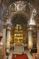 Tiene esta [la capilla mayor] de largo desde la reja a las gradas del altar mayor doce varas [una vara castellana equivalía a 0,836 metros] y así, para dejar libre el uso de las puertas de la capilla y asimismo el de las gradas que se fabricaron para subir al primer cuarto del túmulo, no se le pudo dar a este más que diez varas de largo, ni de ancho más que siete, para guardar la debida simetría. Coronose todo el contorno de varandillas de madera, pintadas de negro y oro, fijándose en ellas unos hacheros de los mismos, en que se afianzaban las hachas. Subíase a este primer cuarto por siete gradas, por tener dos varas de alto, y dejando en el plano todo alrededor vara y media de espacio hasta las barandillas de la coronación, para que se pudiese celebrar sin embarazo la misa y hacer las demás ceremonias del agua bendita e incienso.