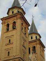 La actual iglesia de la Virgen de las Angustias fue construida entre 1664 y 1671. Las torres se encuentran a ambos lados de la portada, a los pies de la iglesia. Son de planta cuadrada y fabricadas en ladrillo visto, están coronadas por un chapitel octogonal de gran altura, revestido de pizarra, con divisiones realizadas con tejas vidriadas. Presenta la peculiaridad de que uno de los campanarios pertenece a la parroquia y el otro a la hermandad de Nuestra Señora de las Angustias, concedido por Real Cédula de 14 de enero de 1761. Se reservaba al gobernador del arzobispado, que en esa fecha era Diego Merino y Ceballos, maestre-escuela de la catedral: “señalar el modo, días y festividades en que se deberá usar de dichas campanas”. Este hecho generó un conflicto entre ambas instituciones y sus respectivos campanarios, ya que la hermandad usaba “de las campanas a su arbitrio y aun repicando cuando en la parroquia doblan y finalmente con despotismo absoluto”. Actualmente estos dos campanarios cuentan con las siguientes campanas: