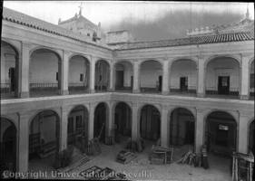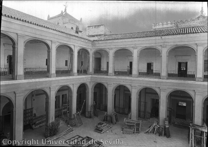 El gran atrio de escuelas de San Hermenegildo es edificio de elegantísima architectura… es quadro perfecto y de muy desahogada espaciosidad, cuyos quatro ángulos contienen veinte arcos de arranque airoso y descollada elevación, coronados en los superiores ángulos de igual número, a quien rodea y adorna seguro y vistoso barandaje de hierro. El interior de los ángulos se vistió de exquisitos tapices, que con viveza de colores y figuras en su laborioso texido serán hoy emulación no competida de los artífices flamencos y fueron embeleso forzoso de la curiosidad y buen gusto. El exterior del atrio se adornó con sedas de colores diferentes, pero guardando en la regulada oposición de ellos cierta especia de harmonía para los ojos. Quedó cubierto lo interior y exterior de cada arco, pendiente en cada uno una hermosa araña, de plata algunas de ellas, otras de cristal y todas de primorosa hechura. Colocándose a breves e iguales trechos excesivo número de cornucopias que llegado el tiempo de la iluminación expusieron a la vista uno de los objectos más delicados. En el frente que corresponde al ángulo del teatro se fixaron dos pinturas de diestrísimo pincel y de magnitud proporcionada a la altura del sitio. Una del gloriosísimo patriarca San Francisco de Asís, santo del día y del nombre del Ilmo. Sr. Arzobispo, la segunda de mi gran padre San Ignacio de Loyola que por muchos títulos era la fiesta suya. Pero lo que dio un nobilísimo resalte al lucimiento fue el remedo de jardín en la parte superior del atrio, ya en los balcones, en los intercolumnios y en las cornisas con que remata la garbosa altura del gigante edificio. Formáronse pulidos encañados, vistiéronse de verduras que disexen bien con la idea, esmaltáronse o entretexiéronse de vistosas flores, varias en el colorido, muchas en el número, grandes en el tamaño para que la distancia no defraudase a la delicia. Eran por el sitio y la hermosura imitación florida de los pensiles de Babylonia y bien lograda oportunidad del mui R.P.M. Joseph de Vargas, a cuyo acierto y conducta, desempeñados a maravilla en otras ocasiones, se fio la dirección de adorno y teatro, y dio en todo pruebas brillantes de su gusto delicado y primoroso ingenio.